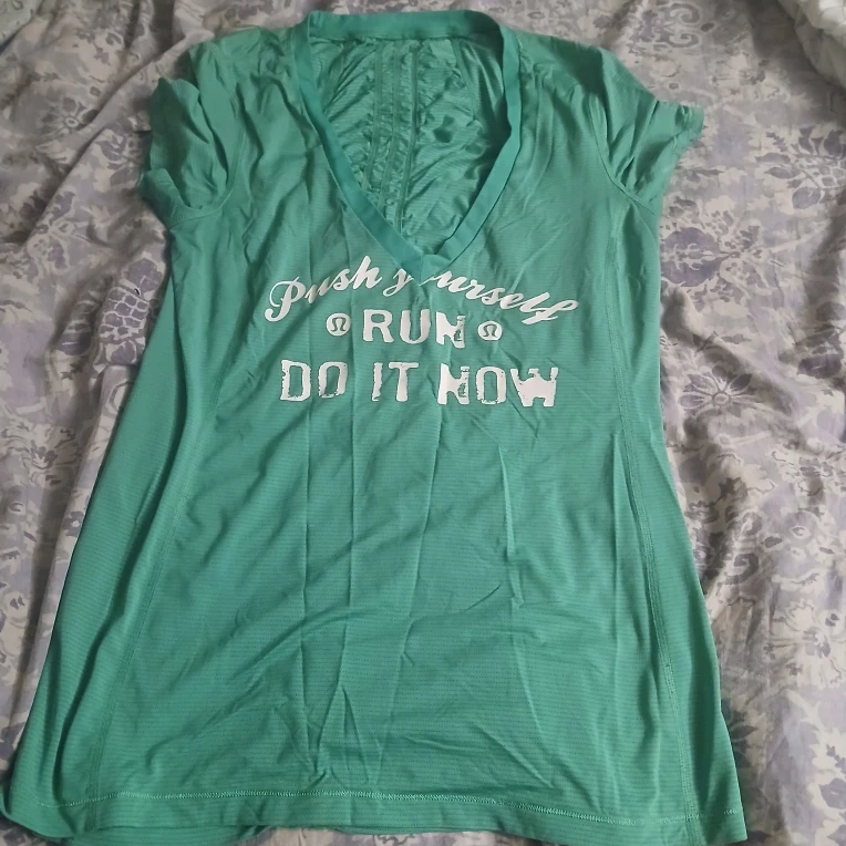 I'm selling a Lululemon run t-shirt in a lovely green colour! The shirt has "Push yourself, Run, Do it now" written on the front. It's in great condition and ready for your next workout