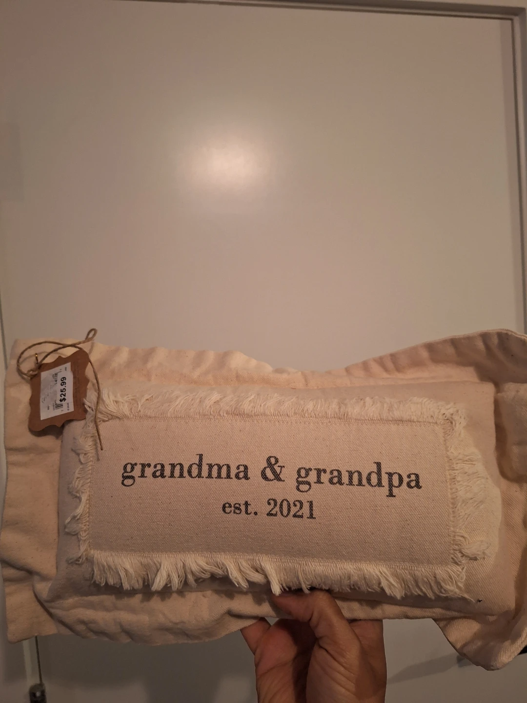 I have a brand new Grandma & Grandpa pillow, established in 2021. It still has the tag on it, originally priced at $25.99. It's a cute decorative pillow!