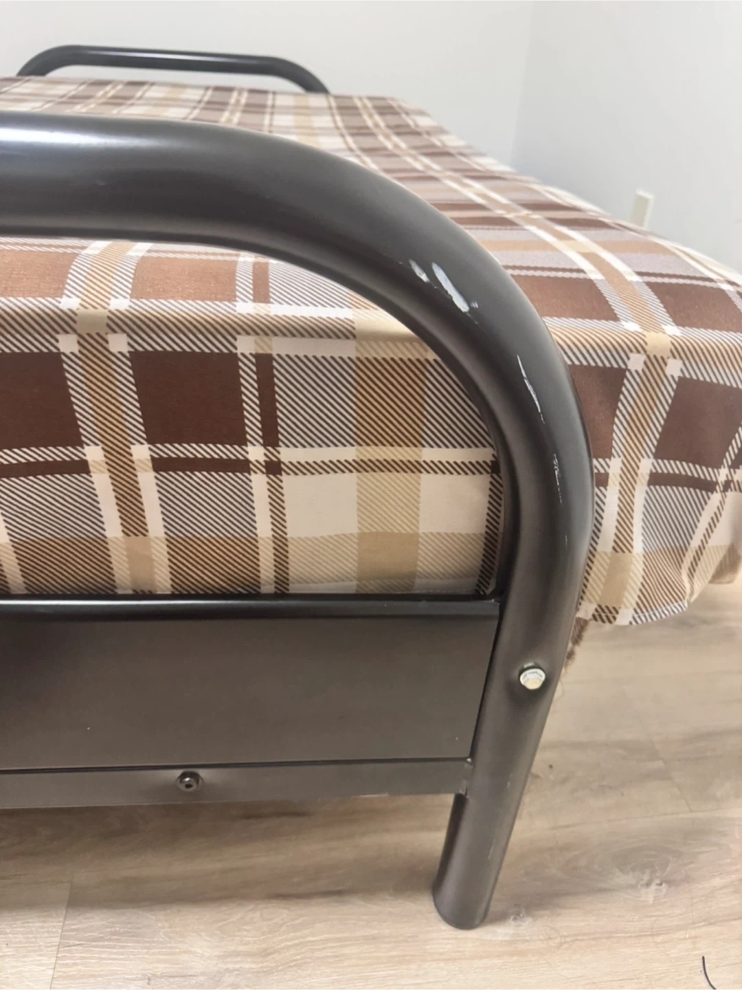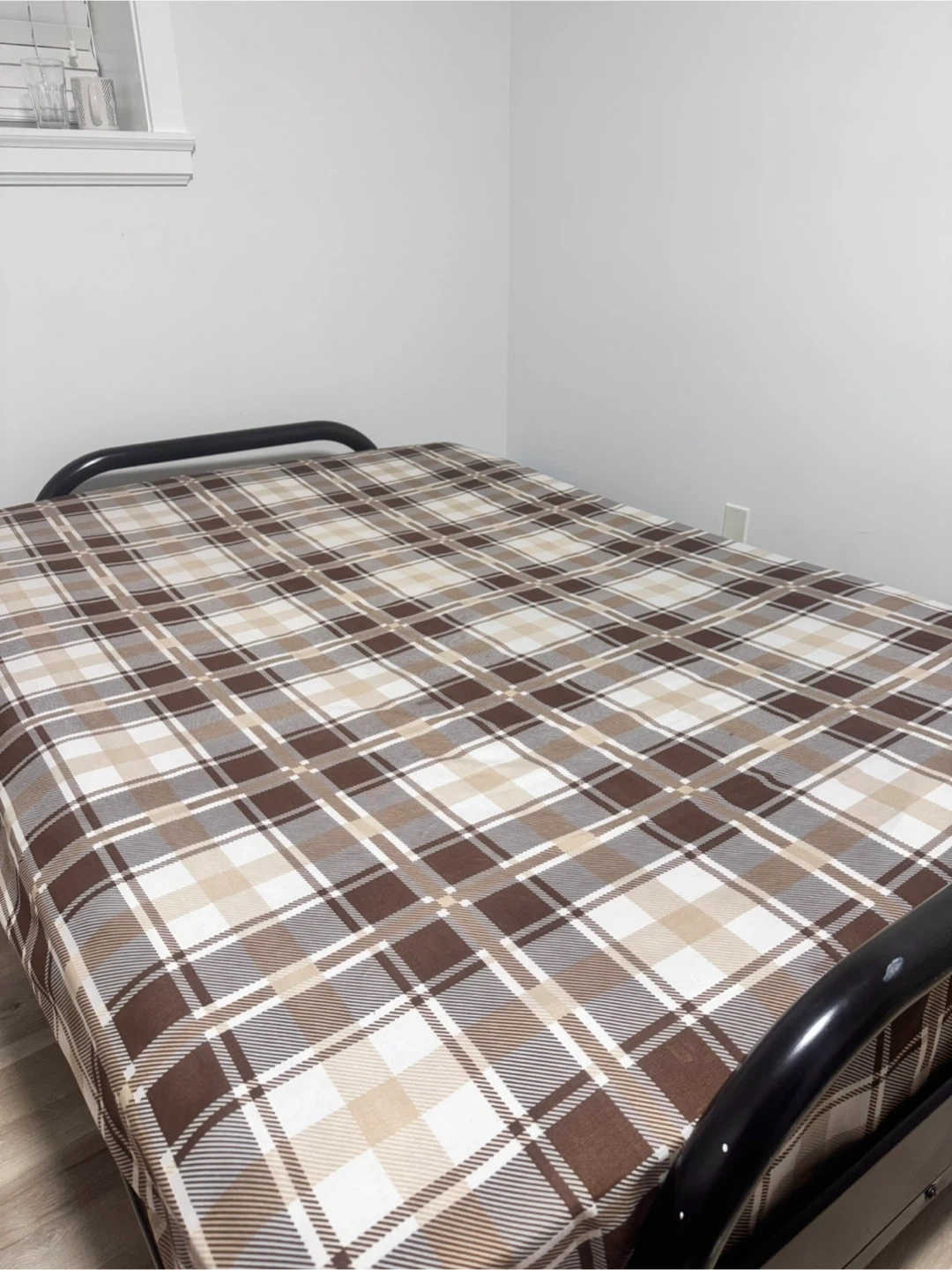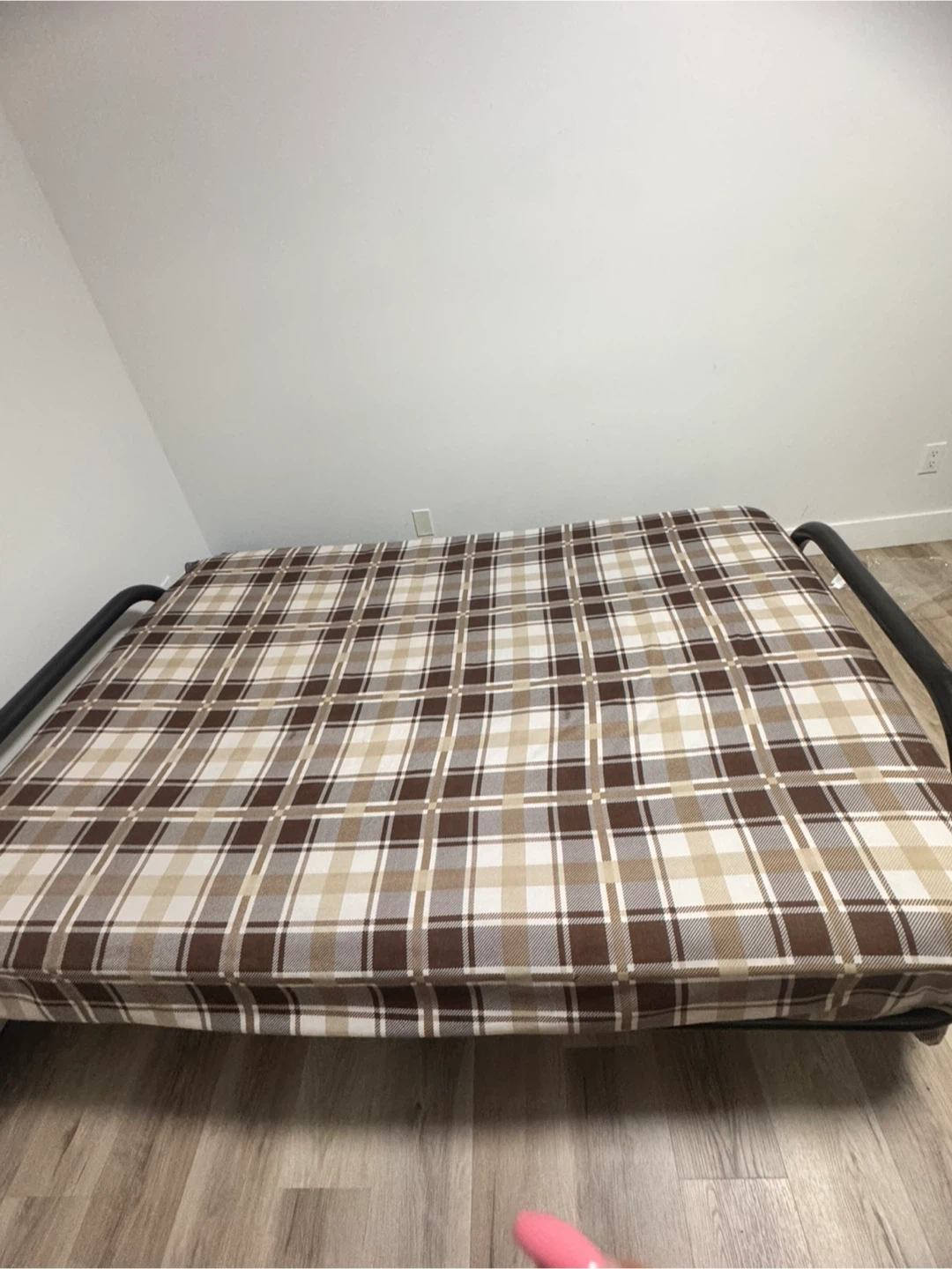 Selling a black metal bed frame, suitable for a double or full-size mattress. It's in good condition and ready to use. There are some minor scratches on the side, as shown in the picture. Queen size Mattress included. Pickup available near Costco Langley. Need to go asap as I am moving out. DM for info