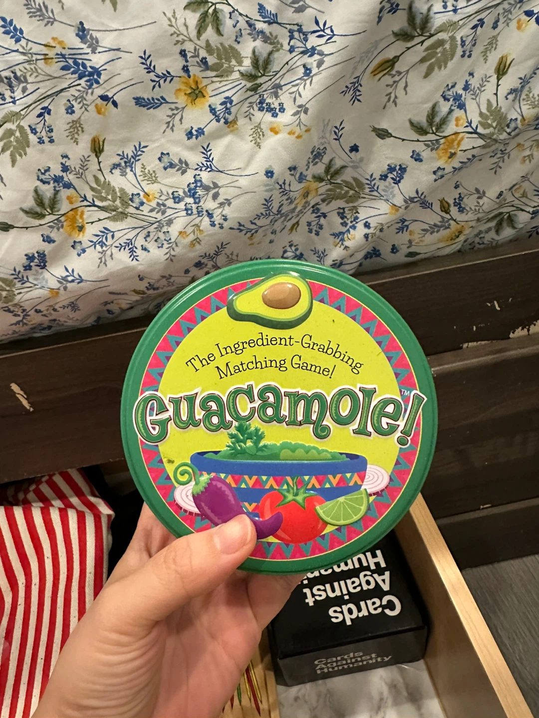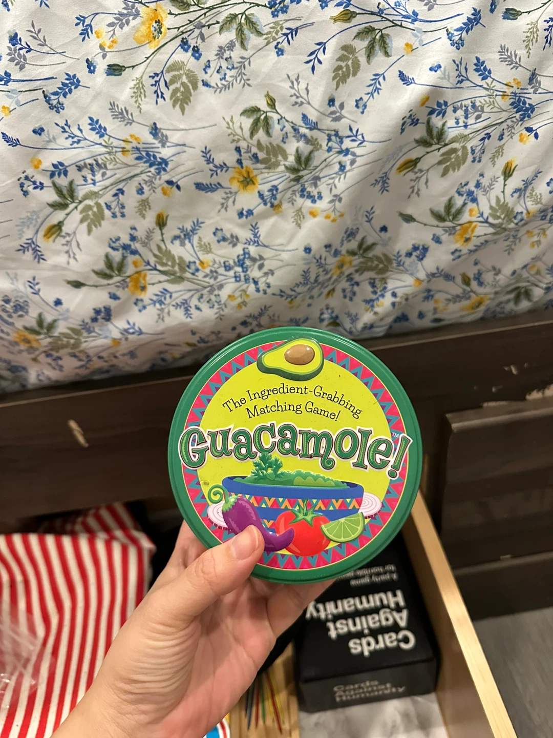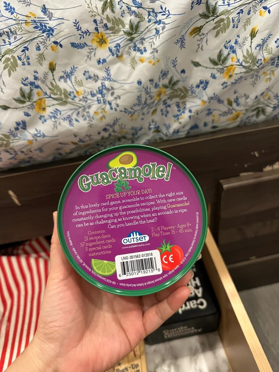 Spice up your day with the Guacamole! ingredient-grabbing matching game! It contains 21 recipe discs, 57 ingredient cards, and 3 special cards. It's a lively card game to scramble to collect the right mix of ingredients to create guacamole recipes. For 2-4 players, ages 8+, and play time is 15-45 minutes