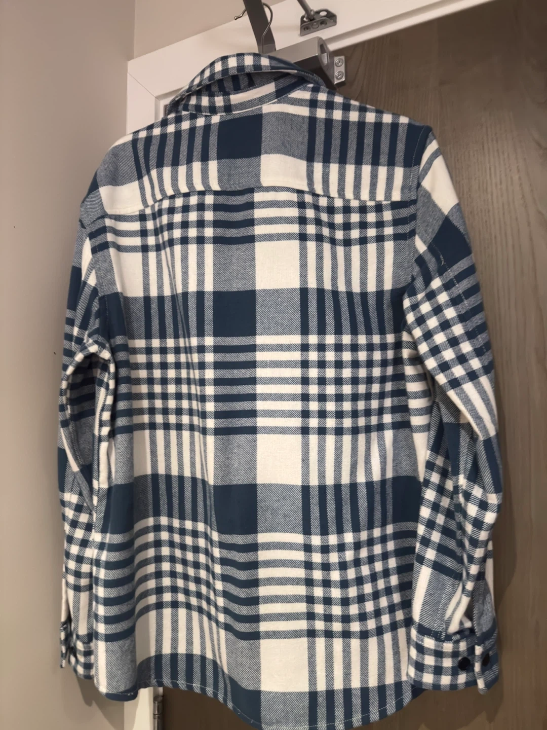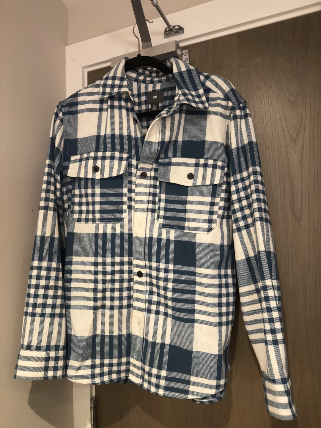 Selling a gently used H&M flannel shirt. It's a classic blue and white plaid pattern, perfect for layering or wearing on its own. The size is M.