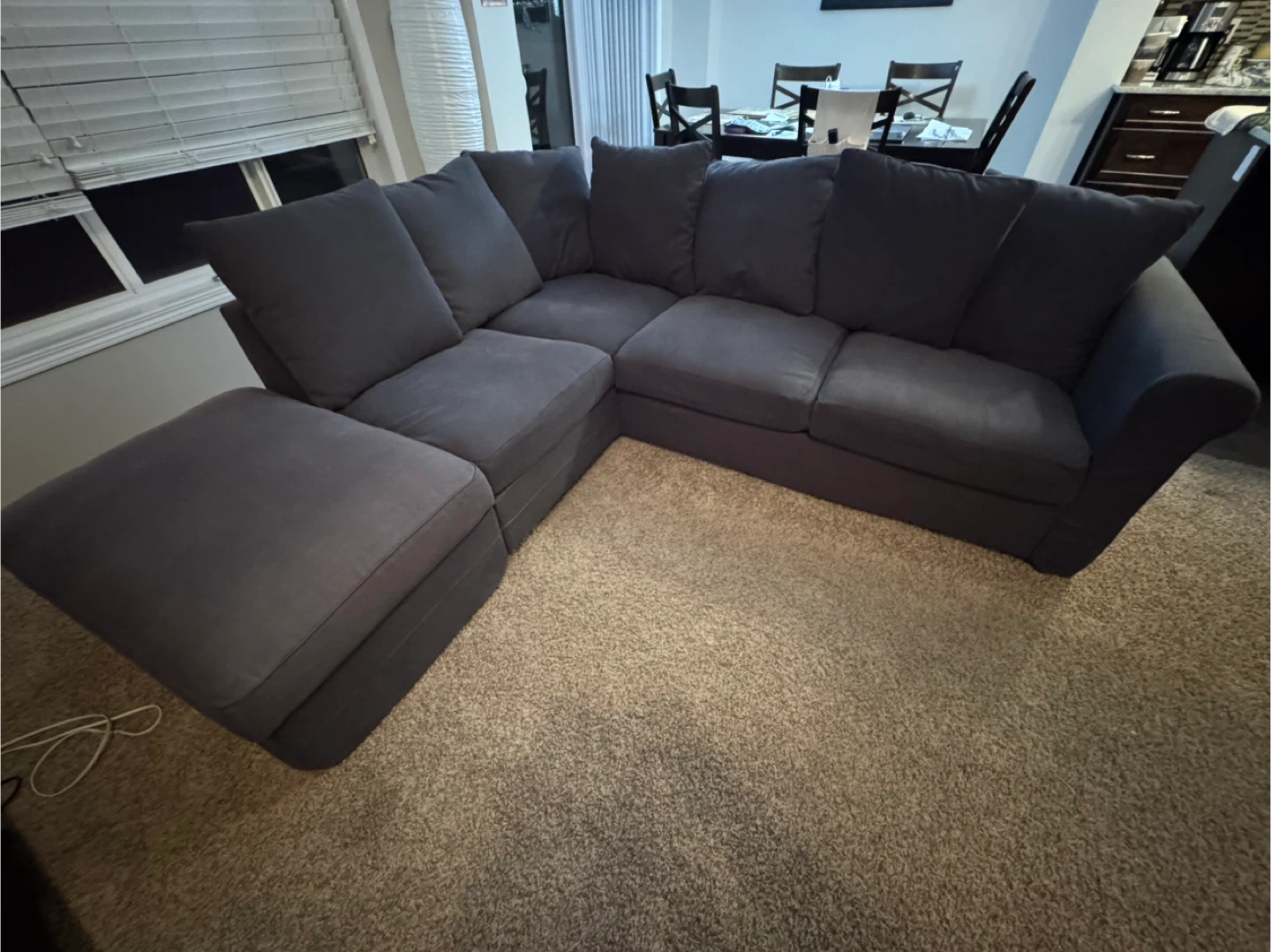Selling a comfy IKEA HÄRLANDA sectional sofa in dark blue! It's in great condition and ready for a new home. This sofa is perfect for lounging and adds a stylish touch to any living space. It's a great addition to any home! Measures approximately 80” x 96”
