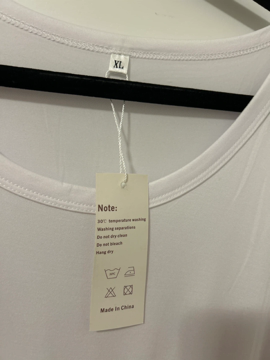 Selling a simple and elegant white maxi dress in size XL. It's in great condition and ready for a new wardrobe! The tag indicates it should be washed at 30°C, washed separately, do not dry clean, do not bleach, and hung to dry