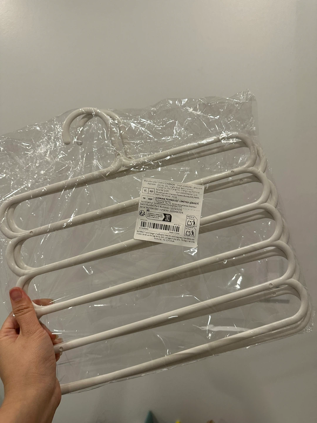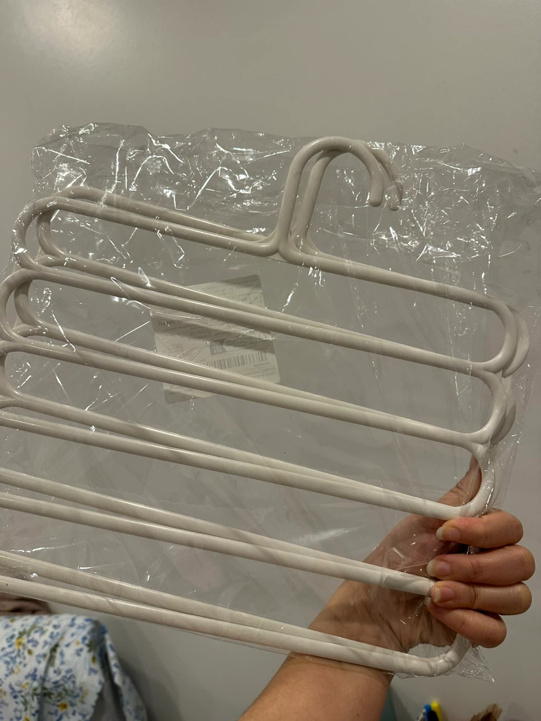 Selling a set of brand new 5-tier trouser hangers! These are great for saving space in your closet and keeping your pants organized. They're white and made of durable plastic, ready to help you tidy up your wardrobe