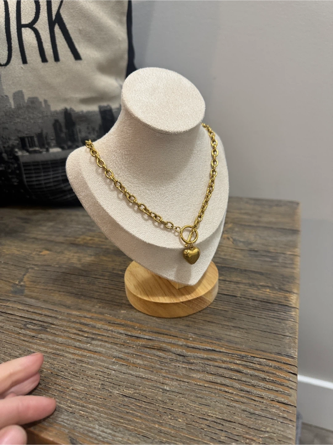This chic gold necklace features a charming heart pendant, perfect for adding elegance to any ensemble.