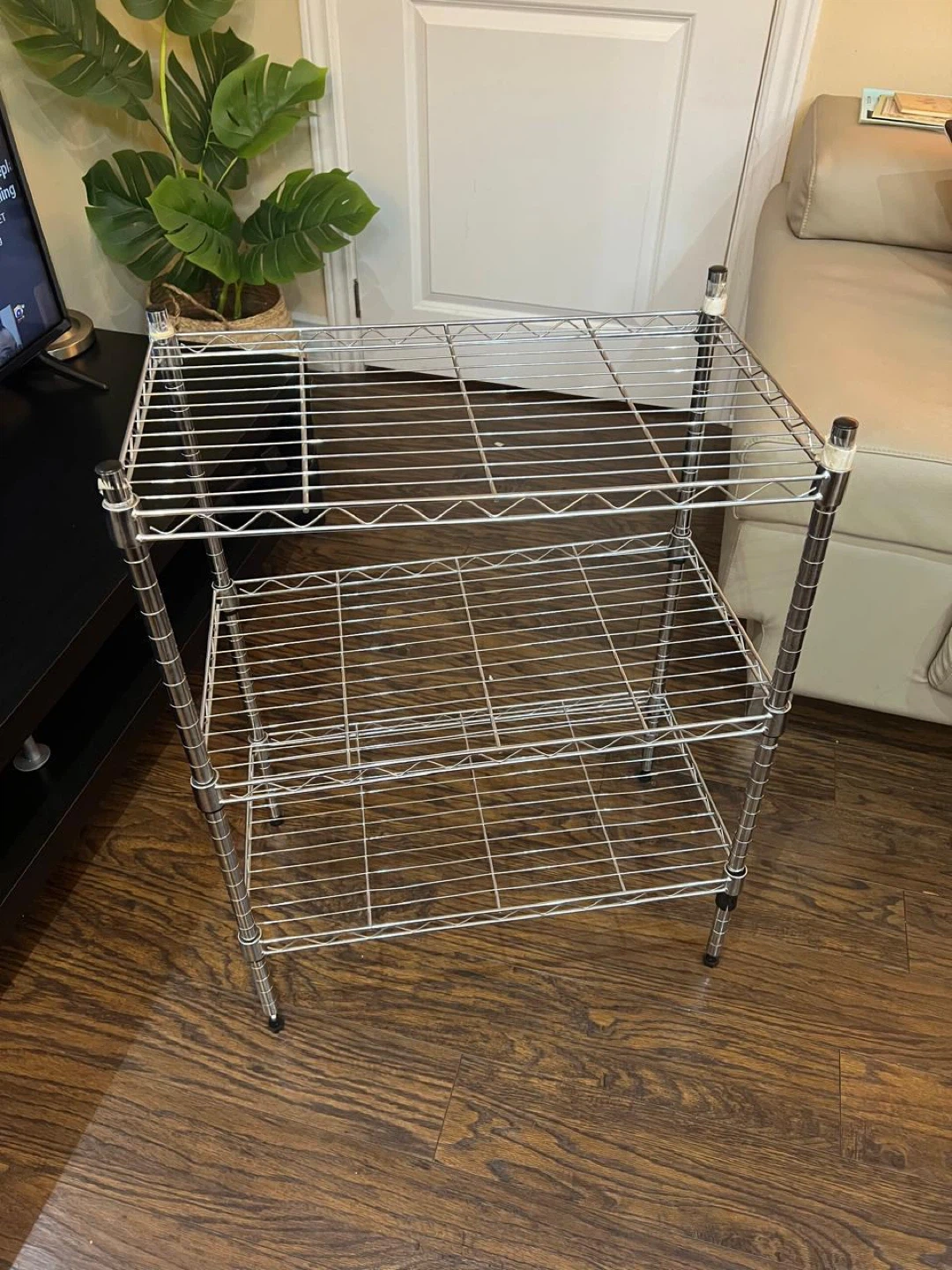 Selling a chrome wire shelving unit. It's in great shape and ready to help organize your space! Perfect for the kitchen, pantry, or garage. It has three shelves.