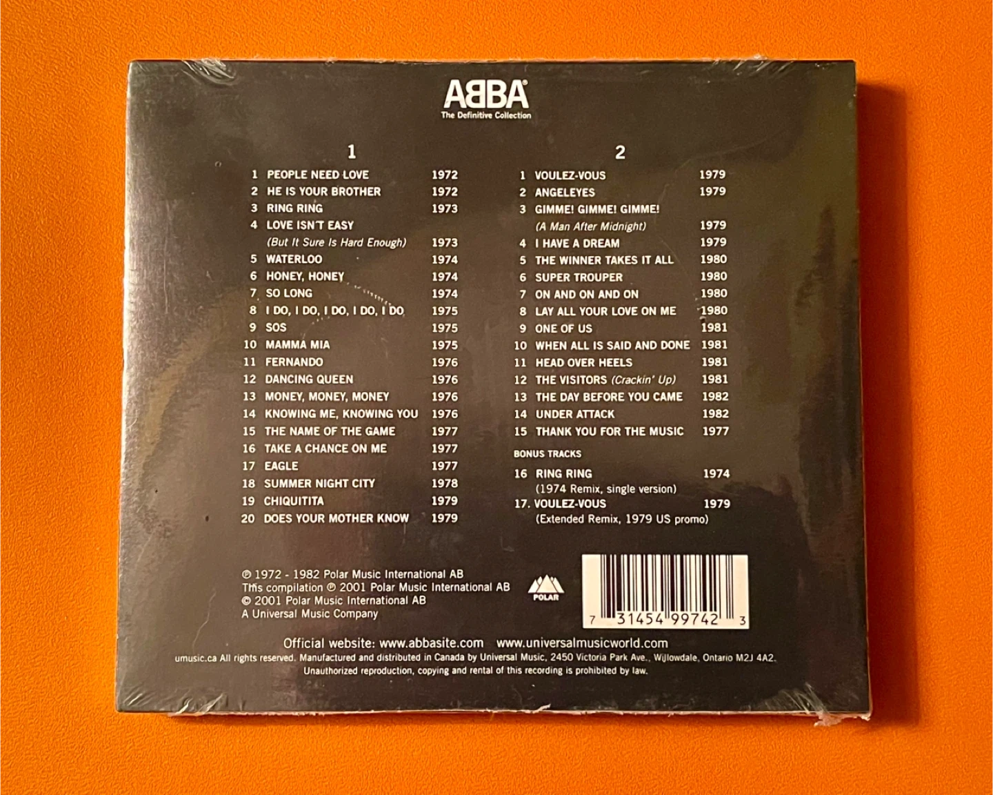 Selling a new and sealed ABBA 2 CD set - The Definitive Collection! This compilation includes every single ABBA A side released from 1972 to 1982 digitally remastered. A great addition to any music collection!