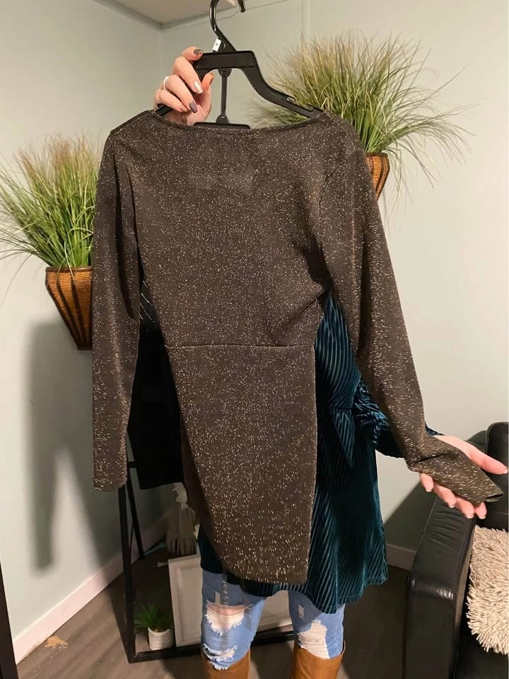 Features a flattering wrap V-neckline, long sleeves, and adjustable side ruching for the perfect fit. The fabric has a beautiful sparkle that catches the light just right — perfect for a night out, holiday party, or date night.