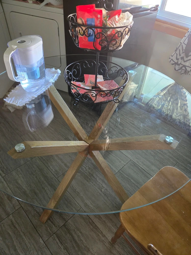 Selling a glass top dining table with a A metal base with a design inspired by the natural lines of wood. It's in great condition and would look lovely in any dining room or kitchen. The table features a clear glass top that allows the beauty of the wooden base to shine through. Perfect for small spaces or cozy gatherings!