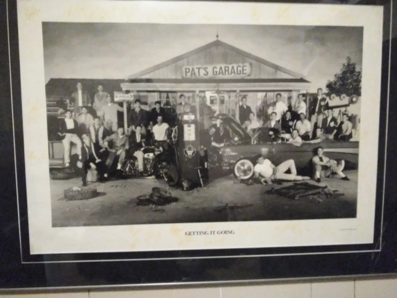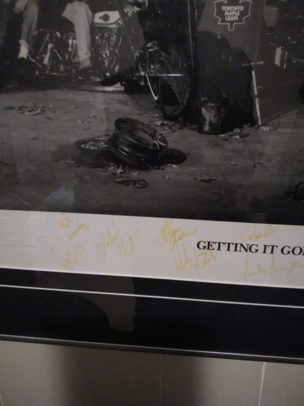 Selling a framed picture featuring the Toronto Maple Leafs. The picture is in black and white and shows a group of people in front of a building labelled 'Pat's Garage'. The frame has signatures of the team all around it. titled 'Getting It Going'
