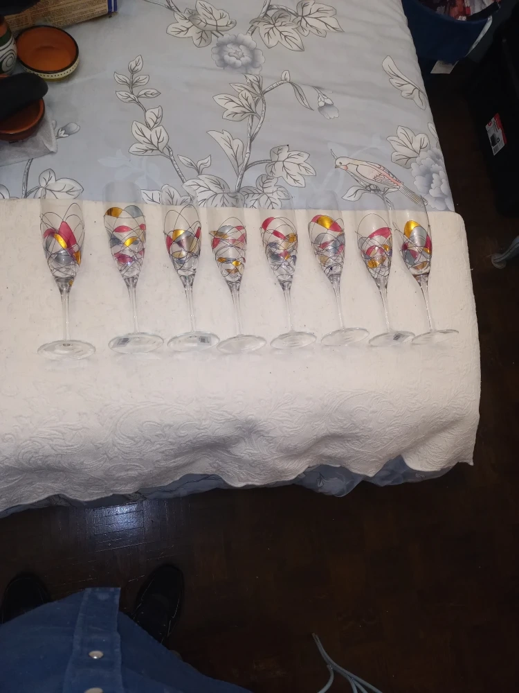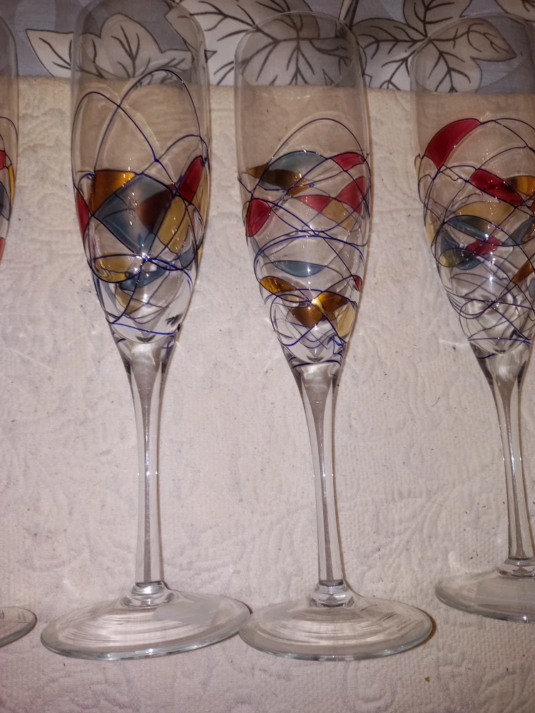 Made in Romania. This could be an ideal gift for the Holiday Season! All 8 champagne glasses are New! Lead free crystal hand blown. Hand wash only! See all pictures provided for more information. They are 10" 1/4 inches in Height.