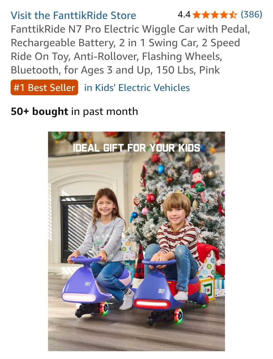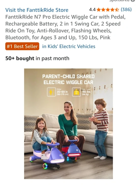 Selling a FanttikRide N7 Pro Electric Wiggle Car in great condition! It features a rechargeable battery and can be used as a 2-in-1 swing car. It has anti-rollover protection and flashing wheels. Suitable for ages 3 and up, with a weight capacity of 150 lbs. Comes with the charger!