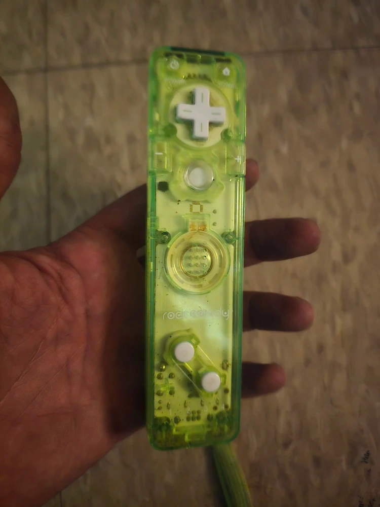 Selling a used Nintendo Wii console. It comes with the power adapter, sensor bar, two Wii remote, and AV cables. Also included are four Wii games: Super Smash Bros, Raving Rabbids Travel in Time, White, and Rock Band. There is also a green Rock Candy controller.