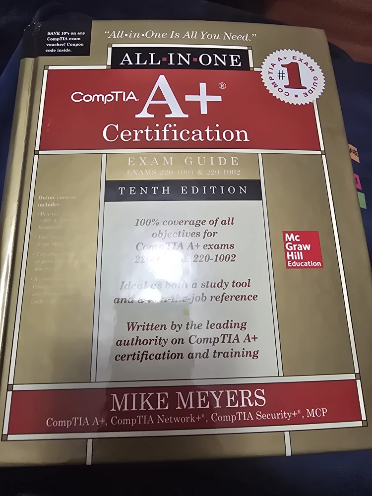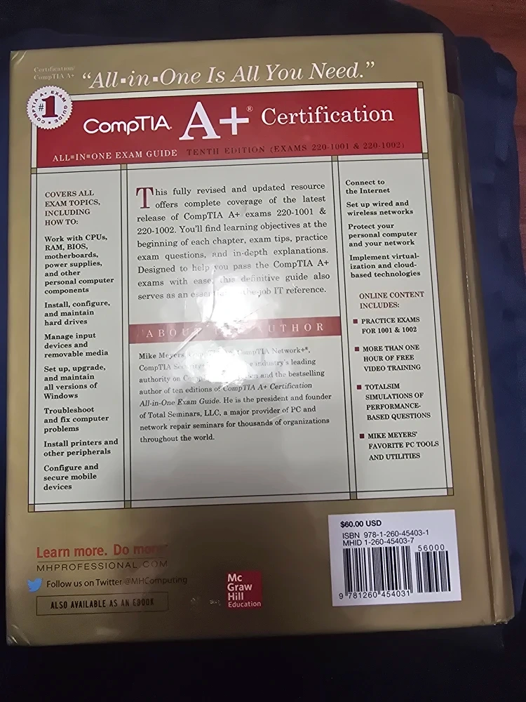Selling a CompTIA A+ Certification All-in-One Exam Guide, Tenth Edition by Mike Meyers. It covers all exam topics, including how to work on CPUs, RAM, BIOS, motherboards and more! The back cover mentions it includes practice exams for 1001 & 1002, and more than one hour of free video training.