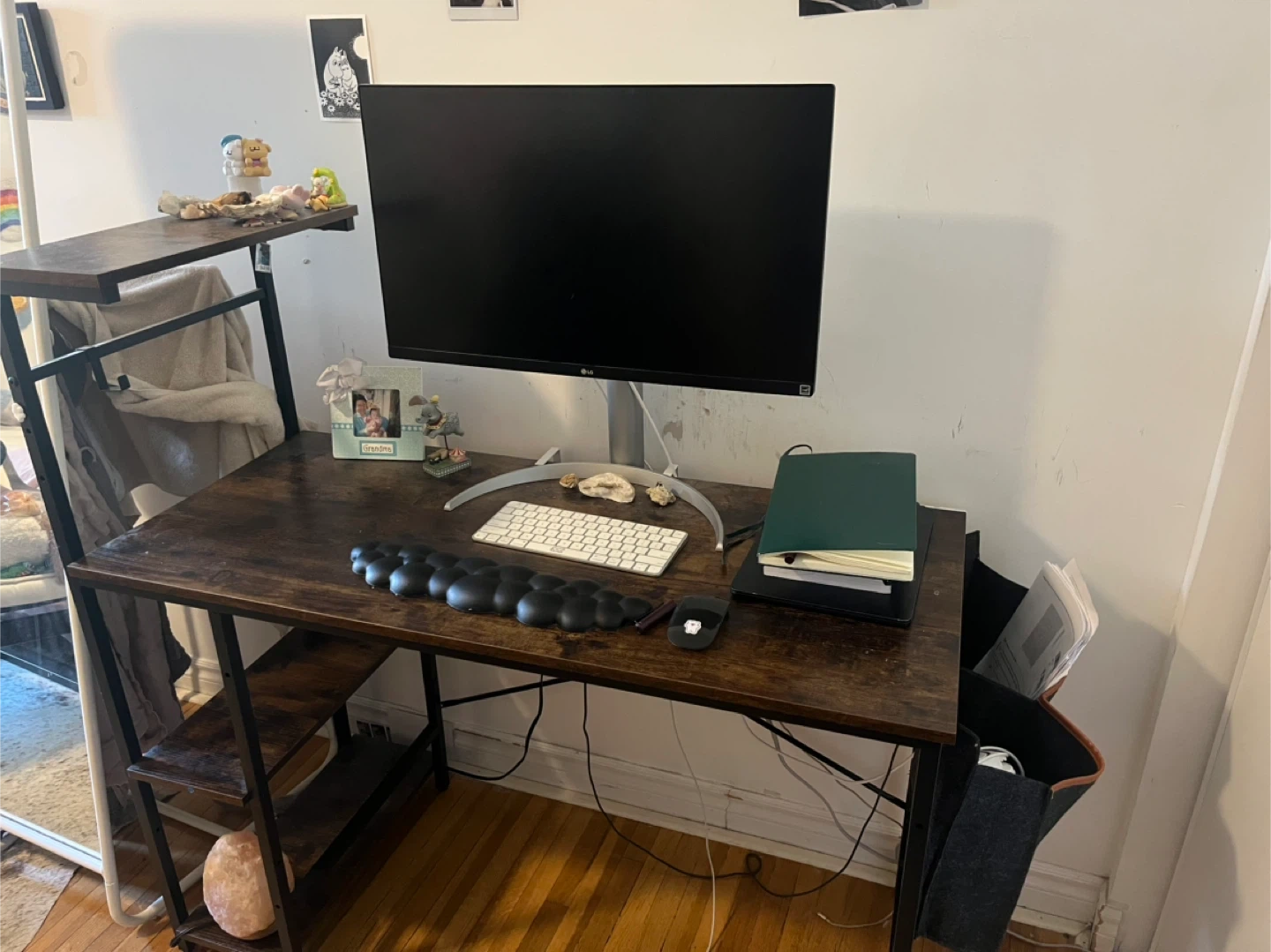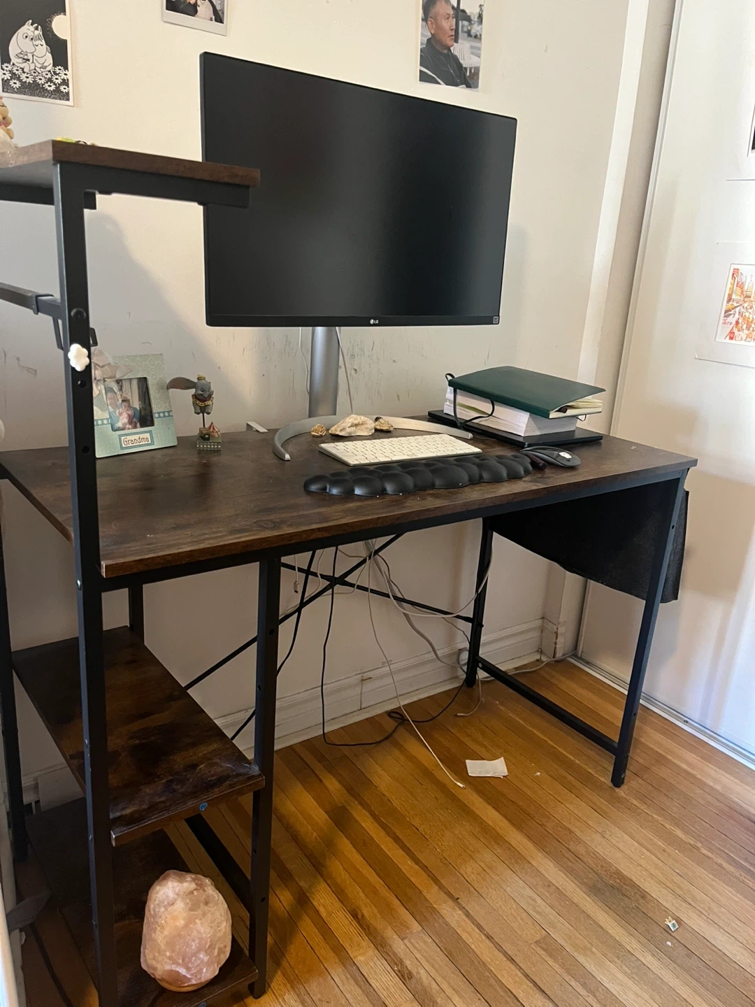 Selling a dark brown computer desk that's perfect for a home office or study space! It features built-in shelves for extra storage and organization. The desk has a sturdy metal frame and a wood-look top. It's in great condition and ready to use!