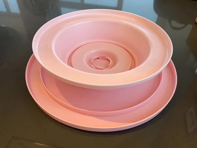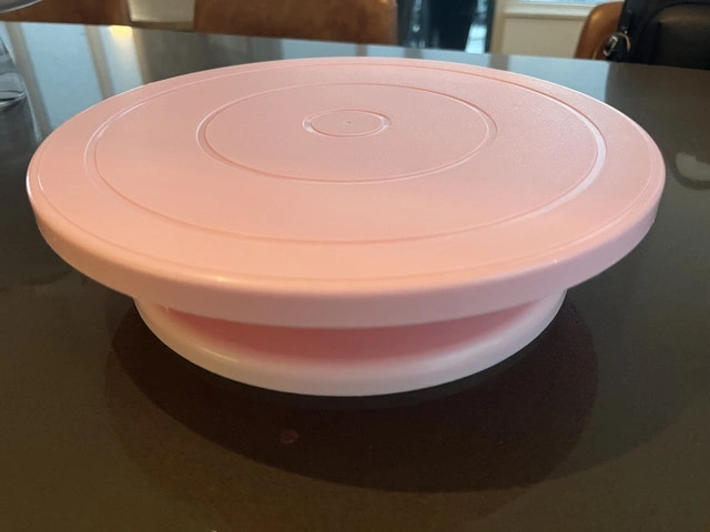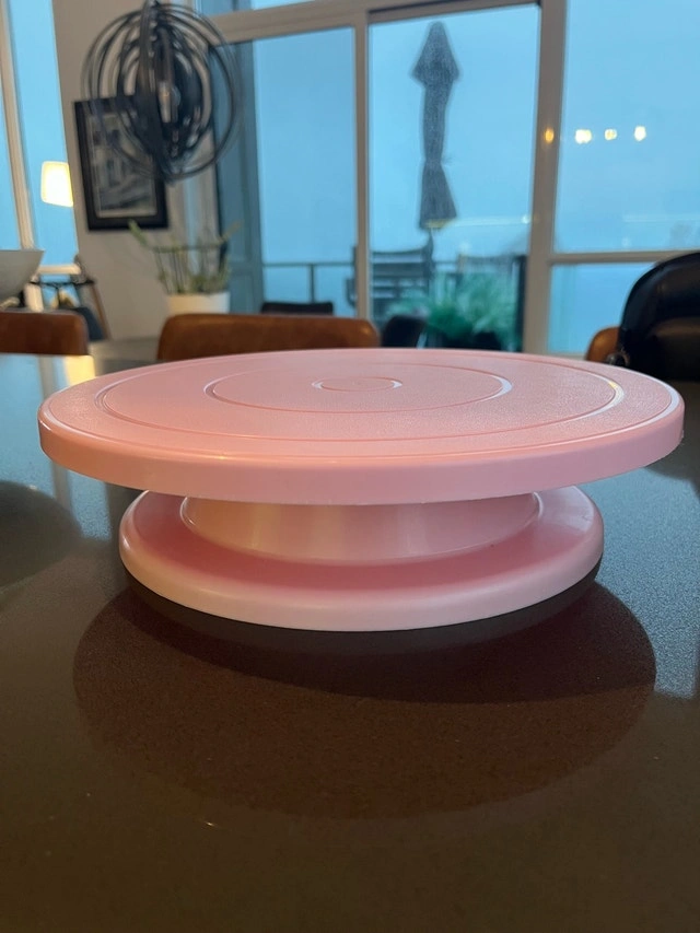 I'm selling a used pink cake turntable, perfect for any baking enthusiast! It's great for decorating cakes and other treats. It has some minor cosmetic wear but is fully functional.