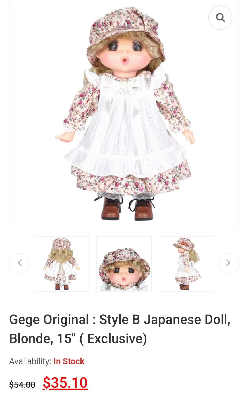 Selling a Mademoiselle Gege Original Style B Japanese Doll! It's a blonde, 15-inch doll. The recommended age is 3+. The original price was $35.10. It comes in the original box