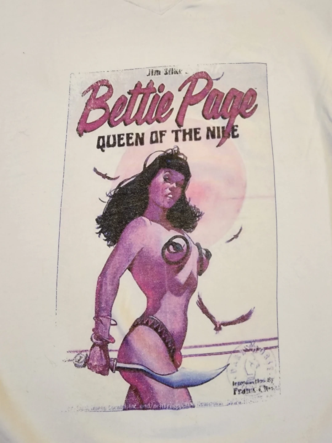 Vintage Bettie Page White stretch Tee Shirt . The image is worn which is also consistent with a vintage Tee shirt . No Tag but im a MED - Large at the time I wore this Tee.