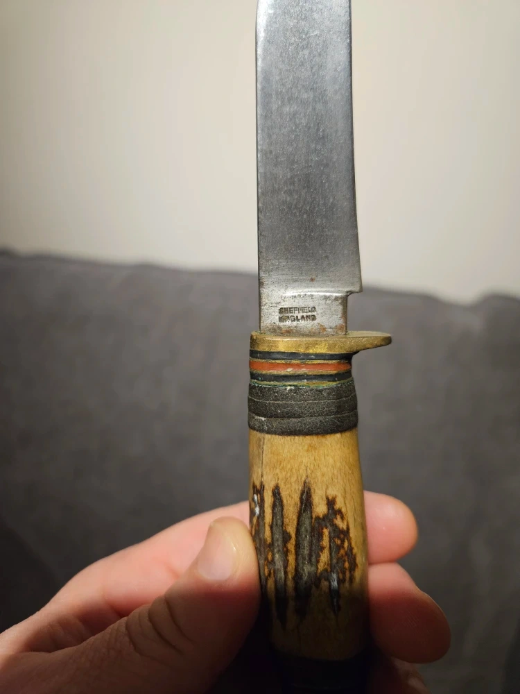 Here is a William Rodgers knife made in Sheffield, England. It comes with a leather sheath. It is in used condition.