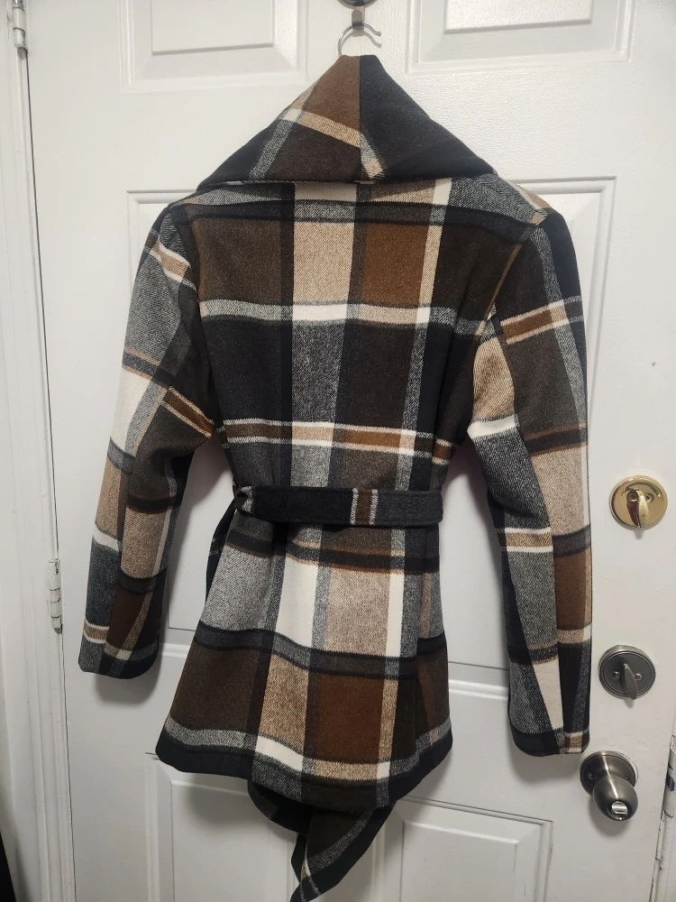 Selling a Chicwish plaid belted coat in size L. The coat features a classic plaid pattern in brown, grey, and white tones. It has a tie belt to cinch the waist. Perfect for fall or winter! Worn once.