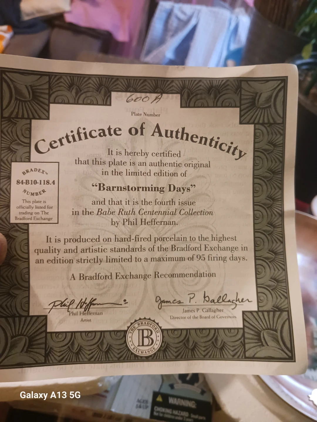 Selling a Babe Ruth Centennial Collection plate titled "Barnstorming Days" by Phil Heffernan. This is the fourth issue in the series. It's produced on hard-fired porcelain and crafted to the standards of the Bradford Exchange. Plate No. 600A.