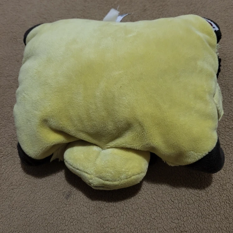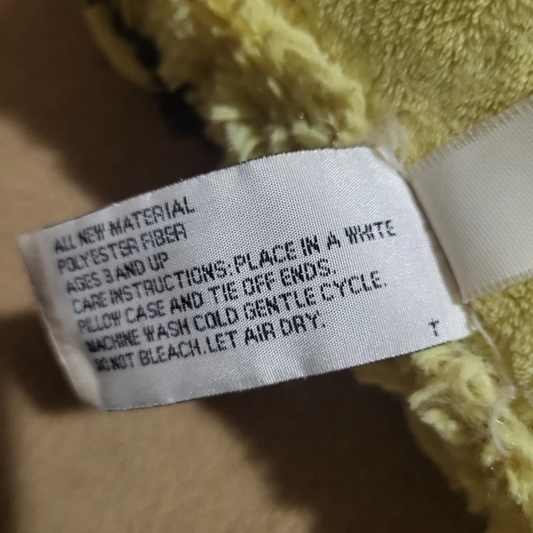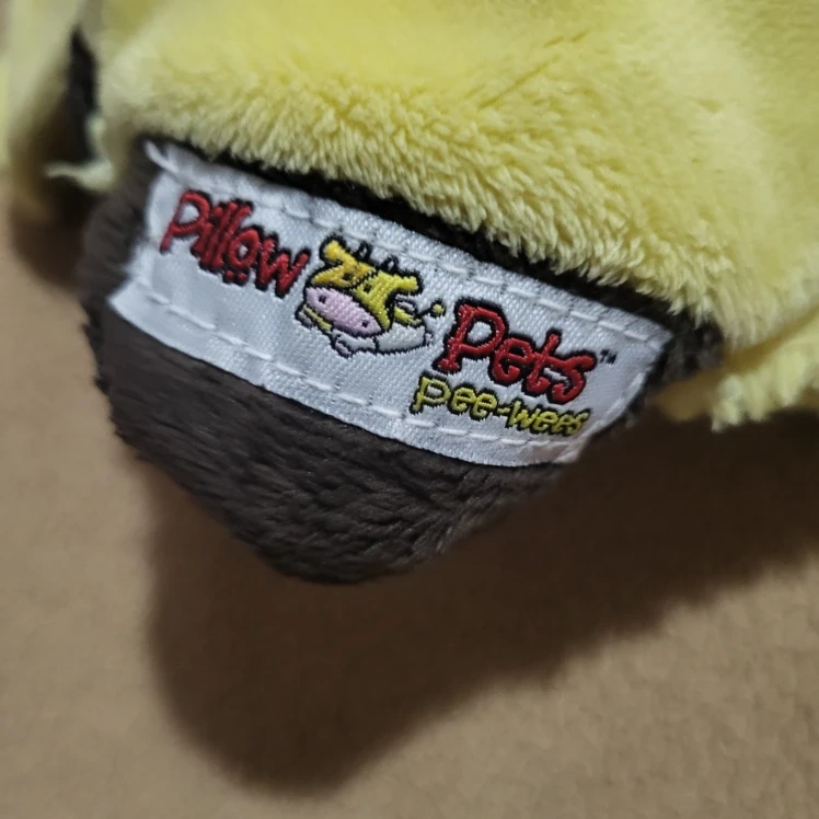 Here's a Pillow Pets Pee-Wees butterfly plush pillow! It's in good condition and made of polyester fibre. It's suitable for ages 3 and up. Care instructions: place in a white pillow case and tie off ends, machine wash cold gentle cycle, do not bleach, let air dry