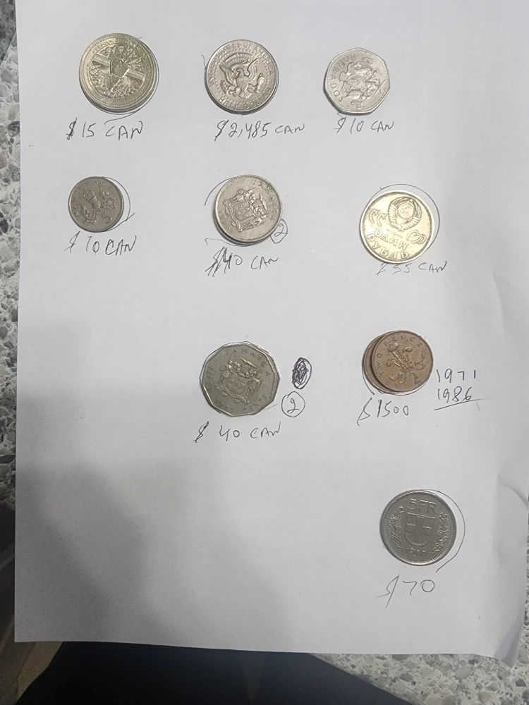 Selling a collection of various Canadian and foreign coins. Some notable ones include coins marked with $15 CAN, $2,485 CAN, $10 CAN, $40 CAN, and a coin marked with 5FR and $70. Great for collectors!