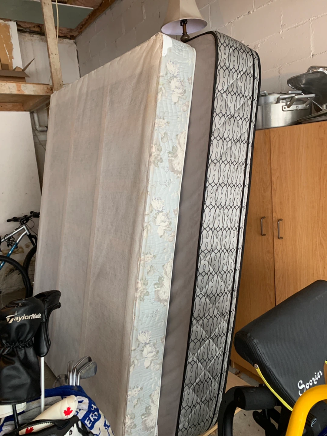 Queen size mattress in good condition. The mattress has a floral pattern on one side and a geometric pattern on the other. Ready for pick up!