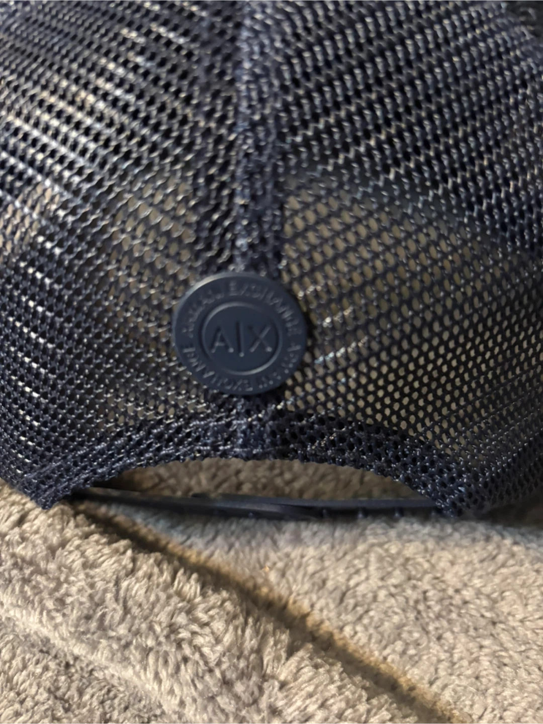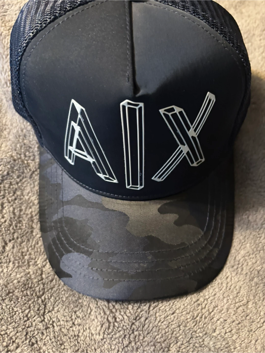Armani Exchange A|X trucker hat! It features a black mesh back and a camo print on the brim. The front has the A|X logo in white. Great for adding a touch of style to any casual outfit