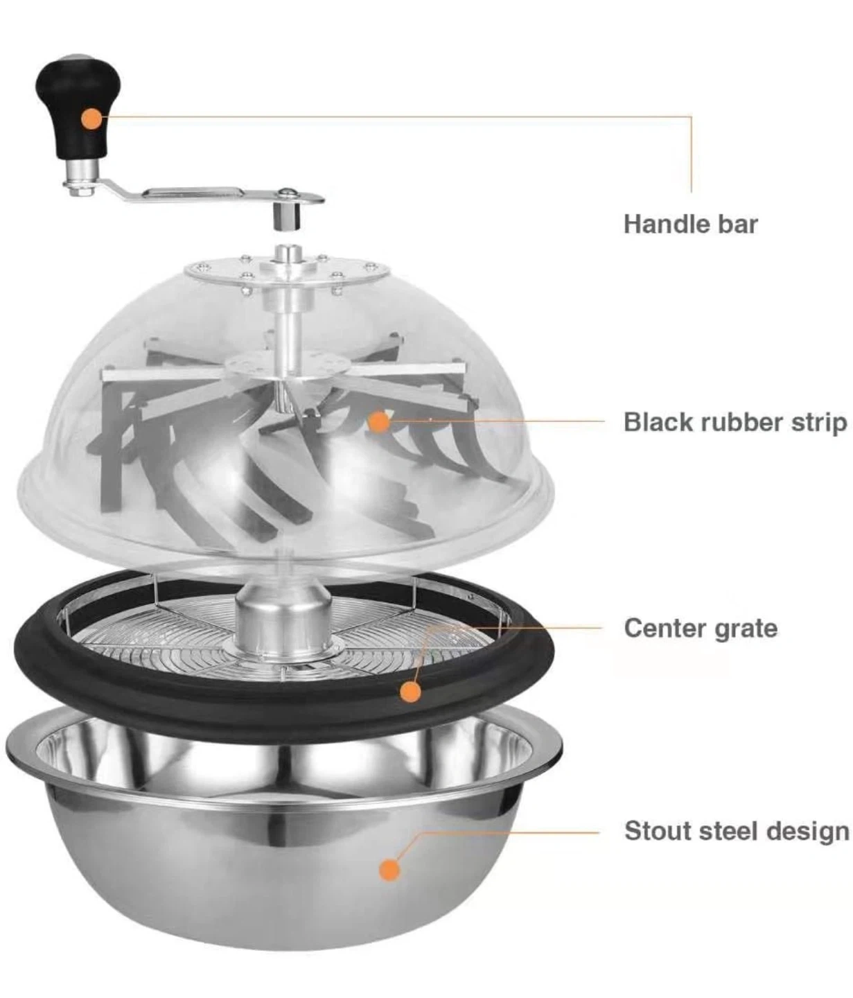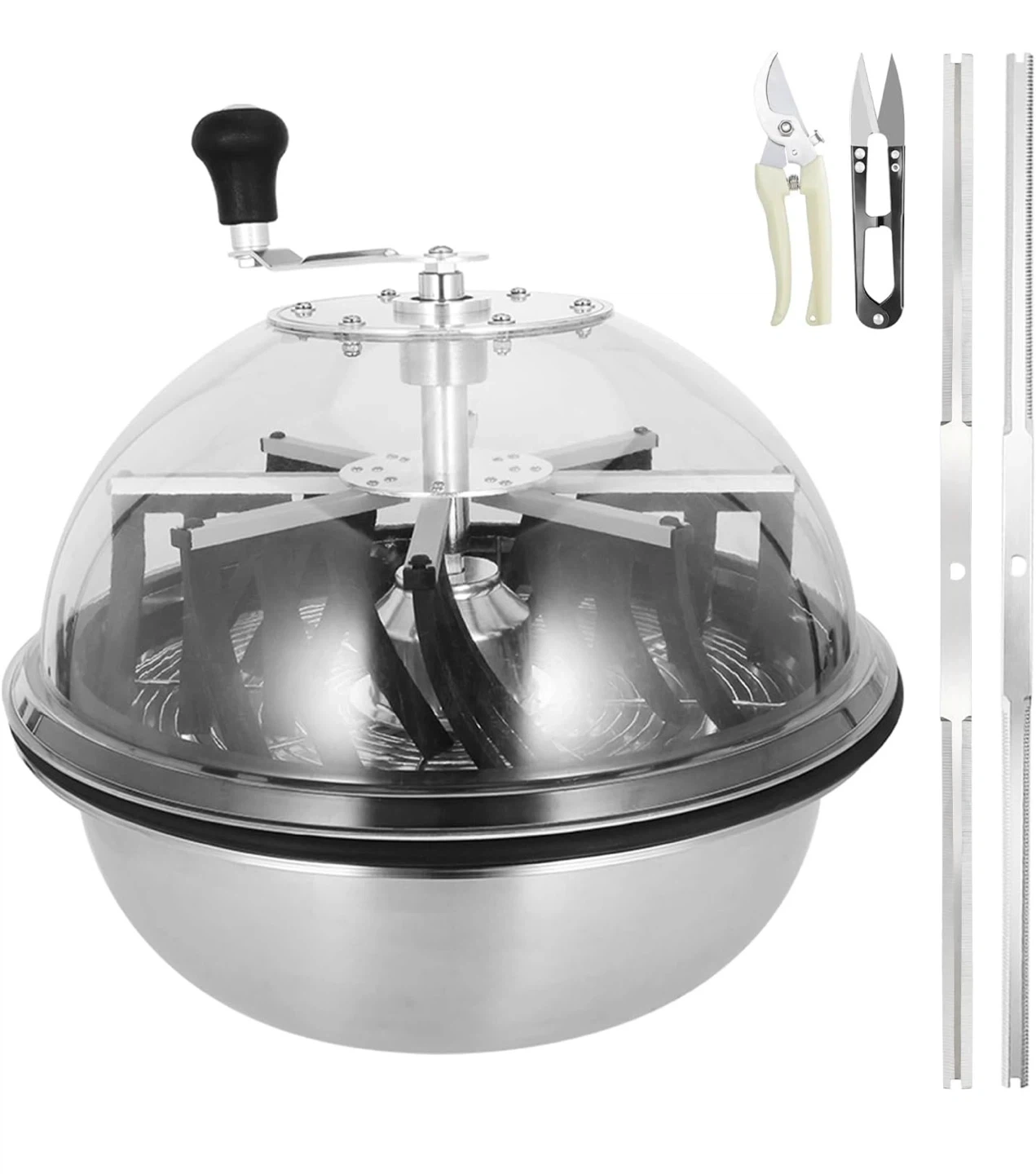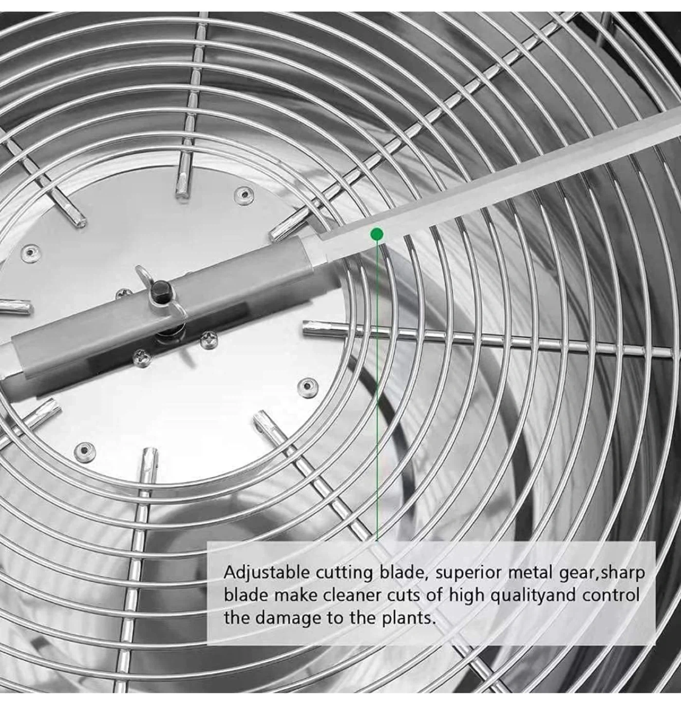 This is a 16-inch herb leaf trimmer bowl. It features an adjustable cutting blade and a superior metal gear. The sharp blade makes cleaner cuts with high quality and control to the damage to the plants. It also has a removable handle for easier storage.