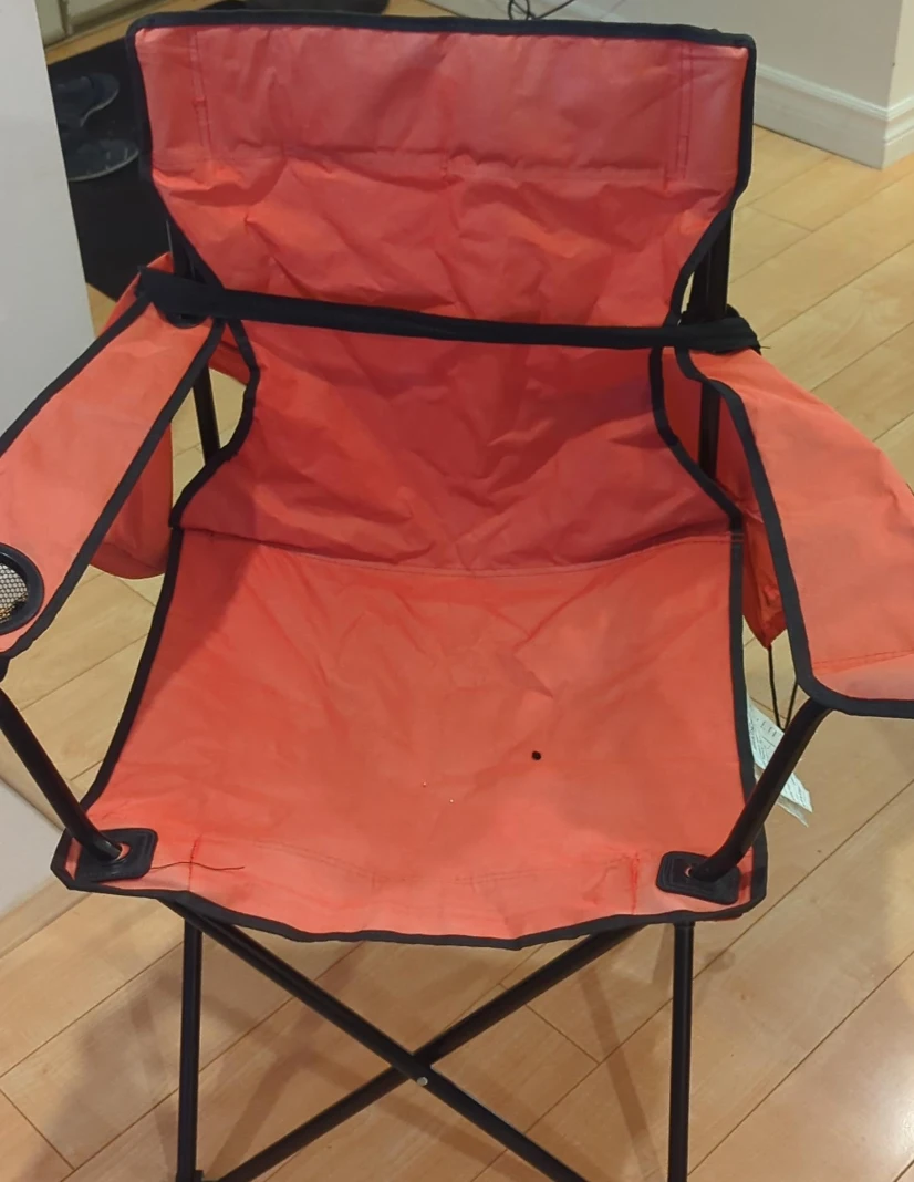 Selling an orange folding camp chair! It's lightweight and easy to bring with you on all your outdoor adventures. Perfect for camping, picnics, or just relaxing in the backyard