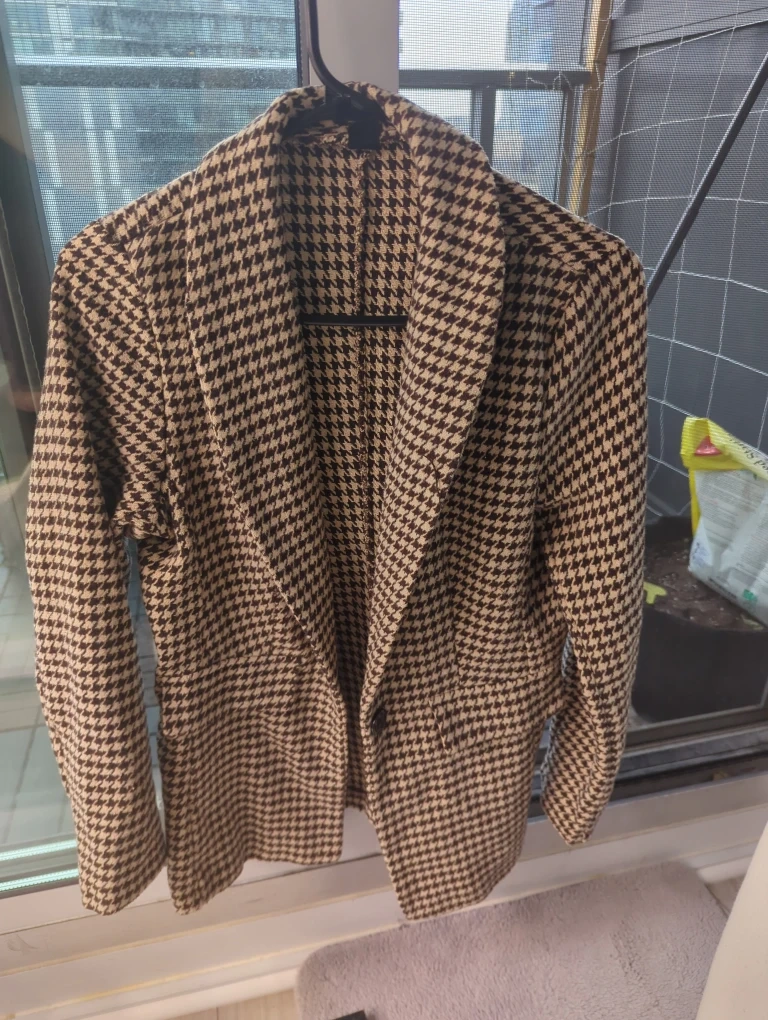 Free blazer with a houndstooth pattern. Has a small hole at the back but once patched it is good again.