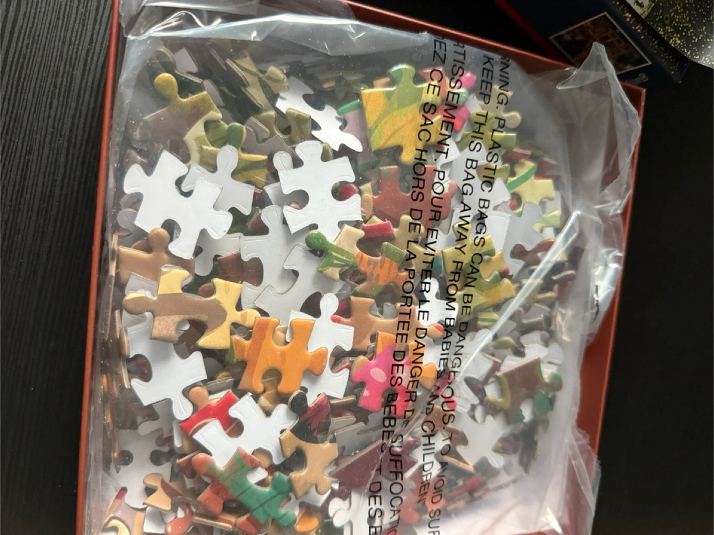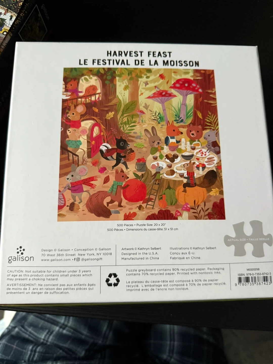 Selling a Galison Harvest Feast 500-piece puzzle. The puzzle is 20" x 20" (51 x 51 cm). It is made with 90% recycled paper and printed with non-toxic ink. It would be great for anyone over the age of 3.