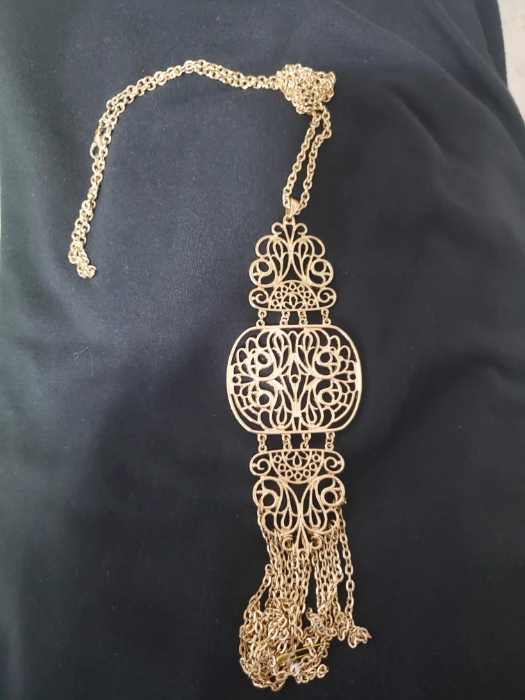 $2 Selling a beautiful gold-tone pendant necklace. It features an ornate, filigree-style design. Perfect for adding a touch of elegance to any outfit!