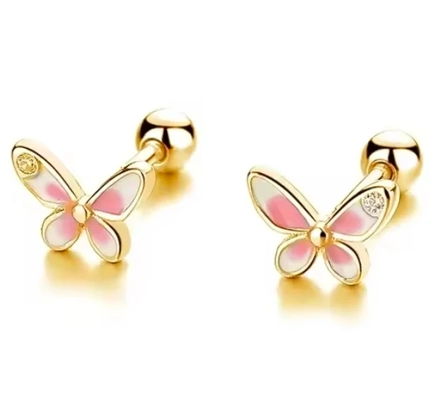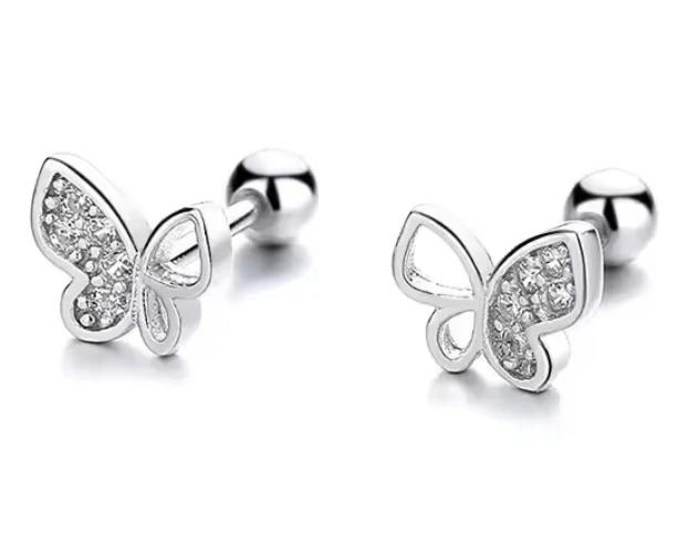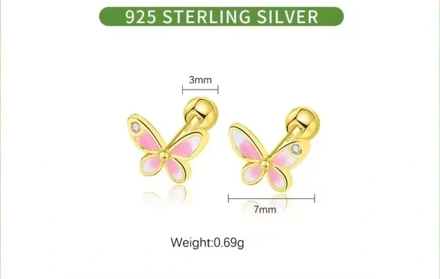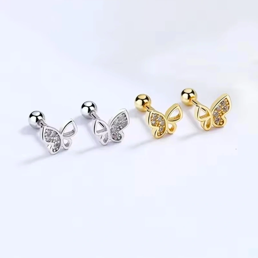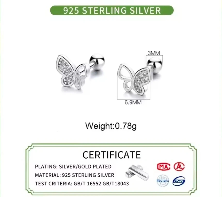 These are cute butterfly stud earrings made of 925 sterling silver. They are available in silver and gold plated options. The earrings have a small Real certified Cubic zirconia detail, adding a touch of sparkle. They are lightweight, with a weight of around 0.7g. Great for any age, simple but cute bright fashion design with a touch of elegance and luxurious Schick style.