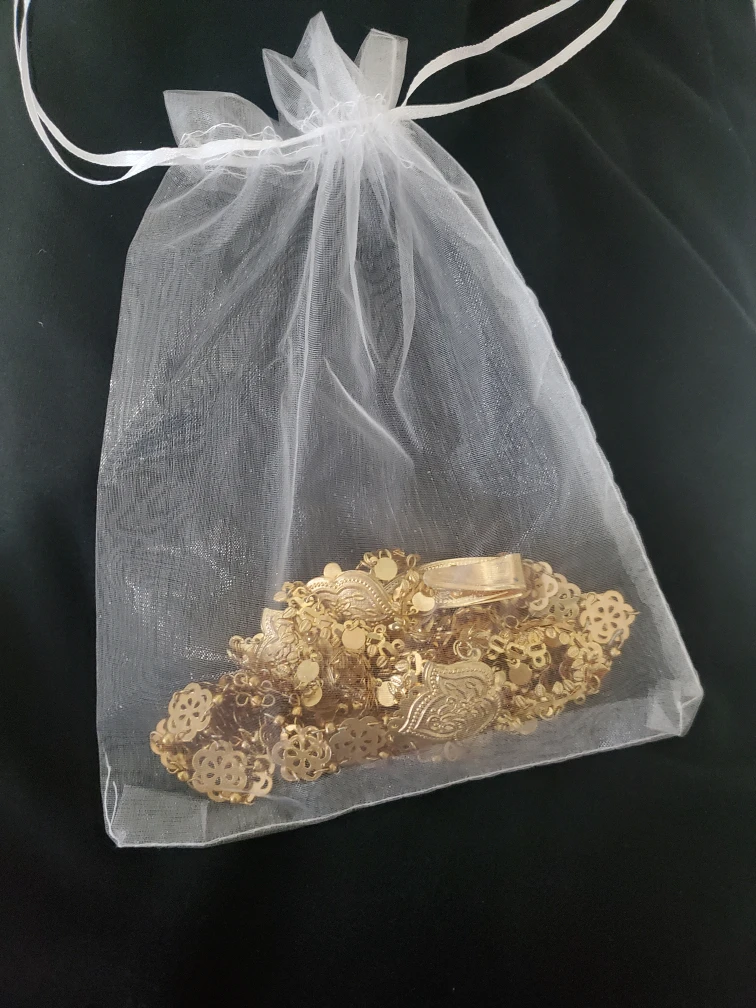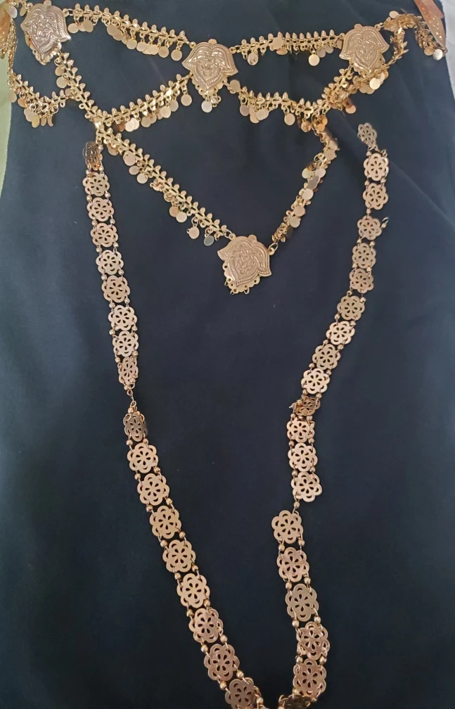 Selling a lovely gold-tone belly dance costume set. It features intricate detailing and a beautiful design. Perfect for dance performances or costume parties!