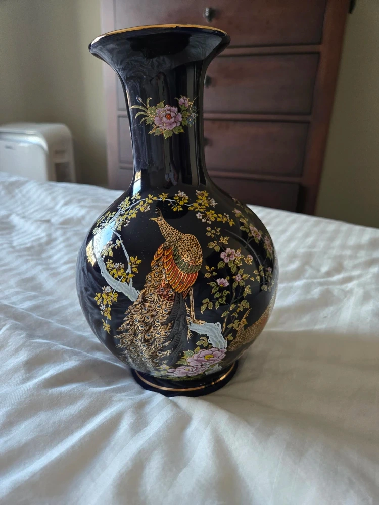 Beautiful vintage vase featuring a peacock design! The vase is a dark blue colour with gold accents and floral details.