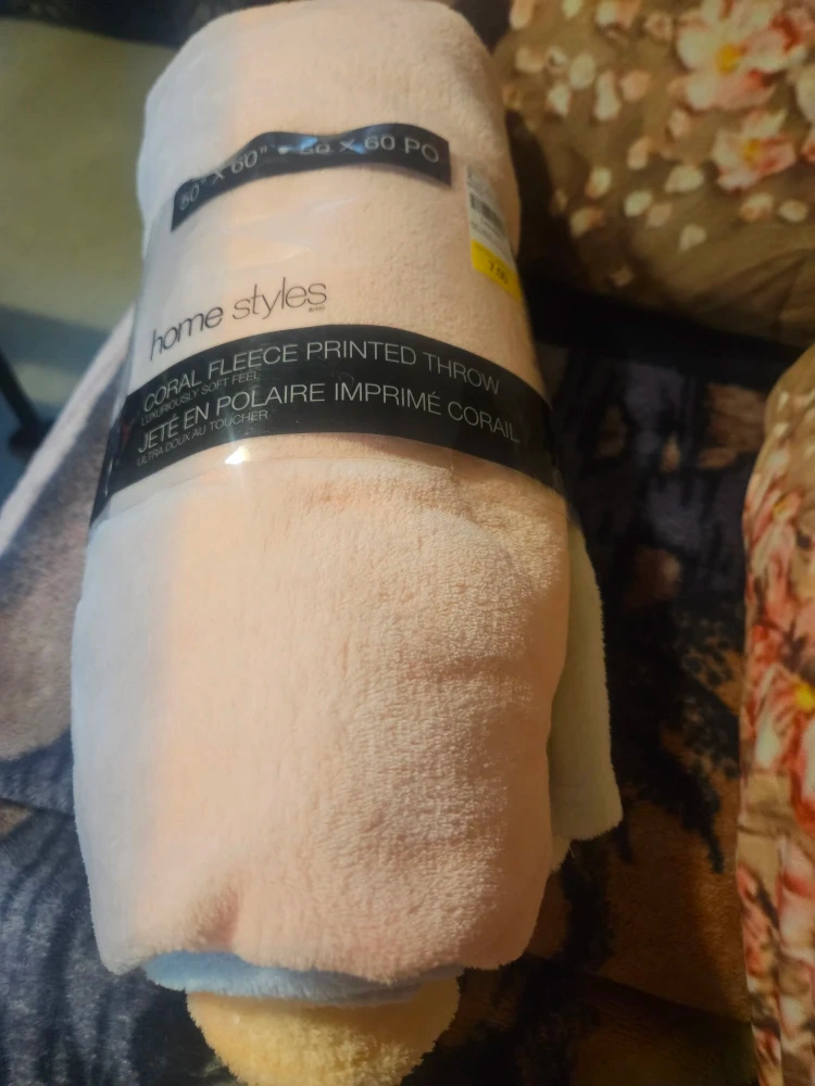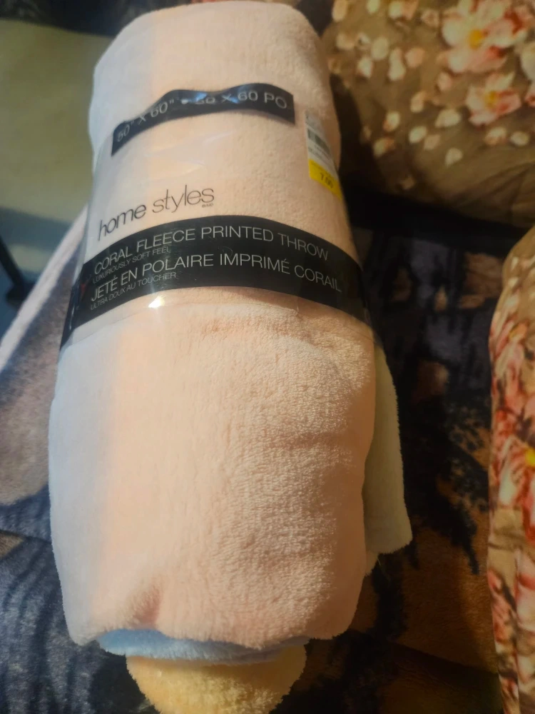 Selling a Home Styles coral fleece printed throw. It's a super soft fleece blanket in a lovely coral colour. The size is 50" x 60". Perfect for cozying up!
