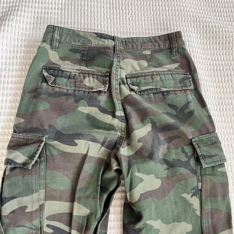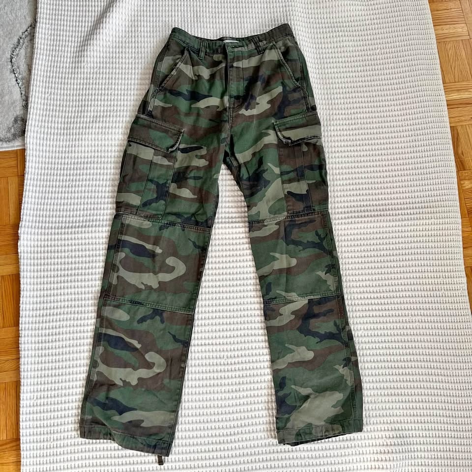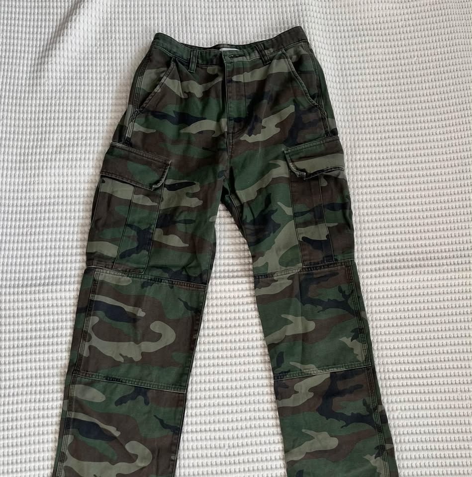 These are great like new condition camo pants from Aritzia - straight leg (with draw string option) and high waisted. Very hip and trendy.