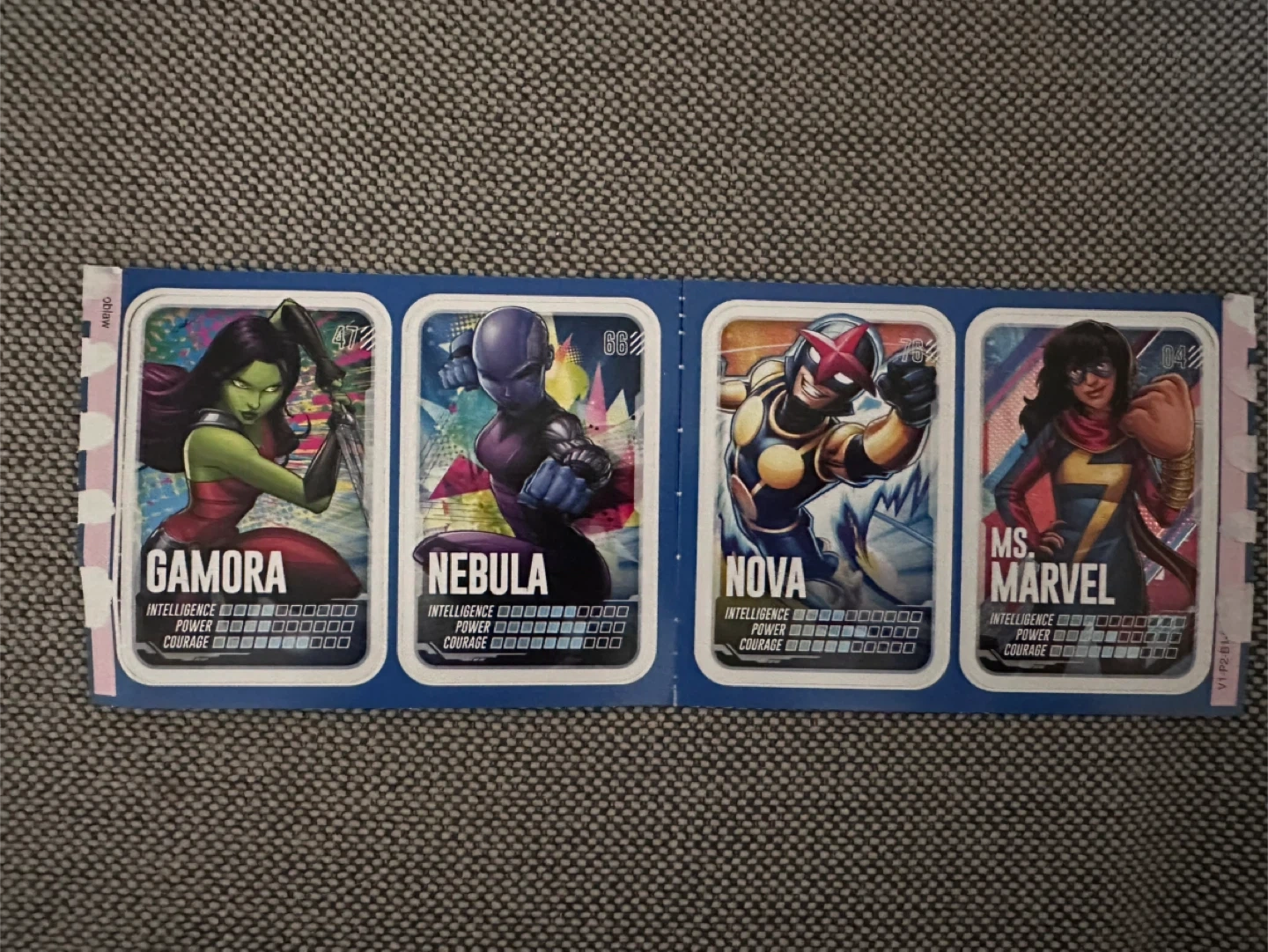Selling a set of Marvel trading cards featuring Gamora, Nebula, Nova, and Ms. Marvel! These cards showcase their intelligence, power, and courage stats. A great addition for any Marvel fan or collector