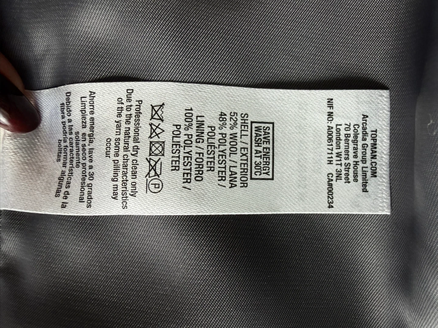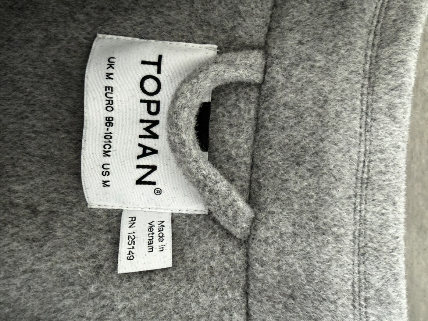 Selling a Topman overcoat in a nice wool blend! It's a size M and in great condition. The shell is 52% wool and 48% polyester, with a 100% polyester lining. It's a stylish and warm coat for the colder months!