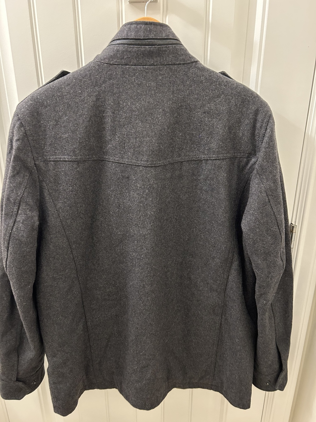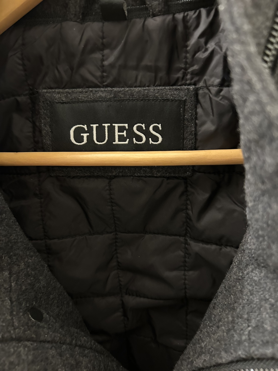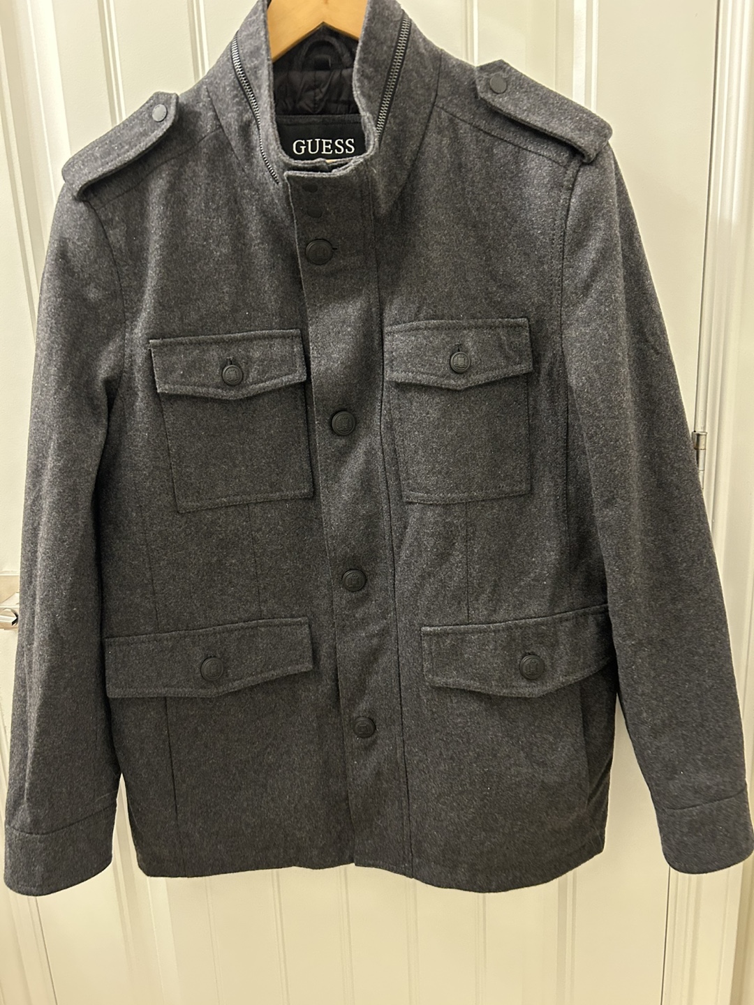 Here's a stylish Guess jacket in a grey wool blend. It's a military-style jacket that would be a great addition to your wardrobe!