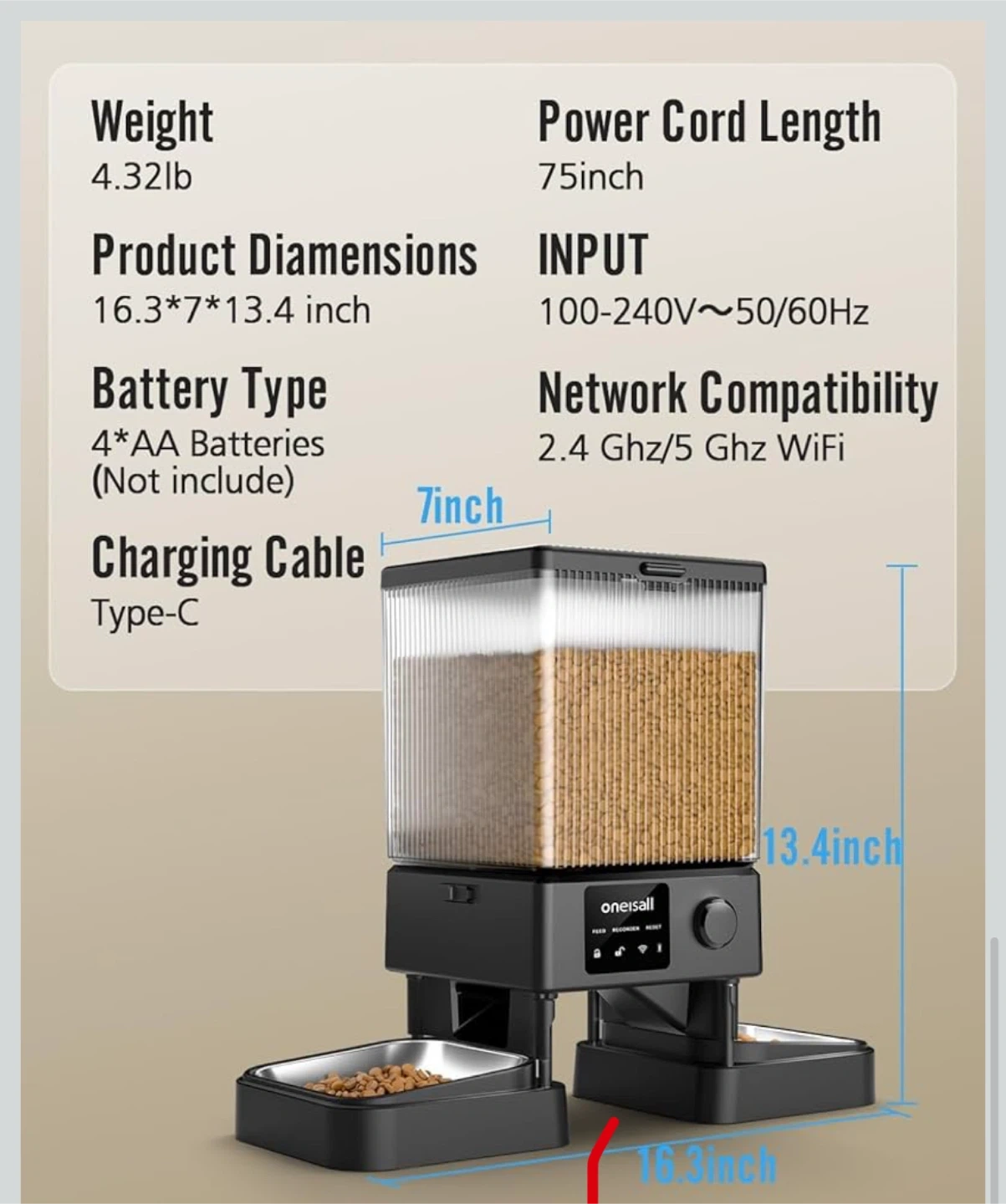 I'm selling a Oneisall automatic pet feeder with a dual bowl design. This feeder is perfect for feeding two pets at the same time.