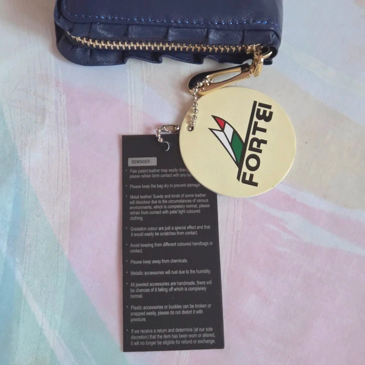 Selling a brand new navy blue long wallet with ruffle accents and a ribbon embellishment at the front