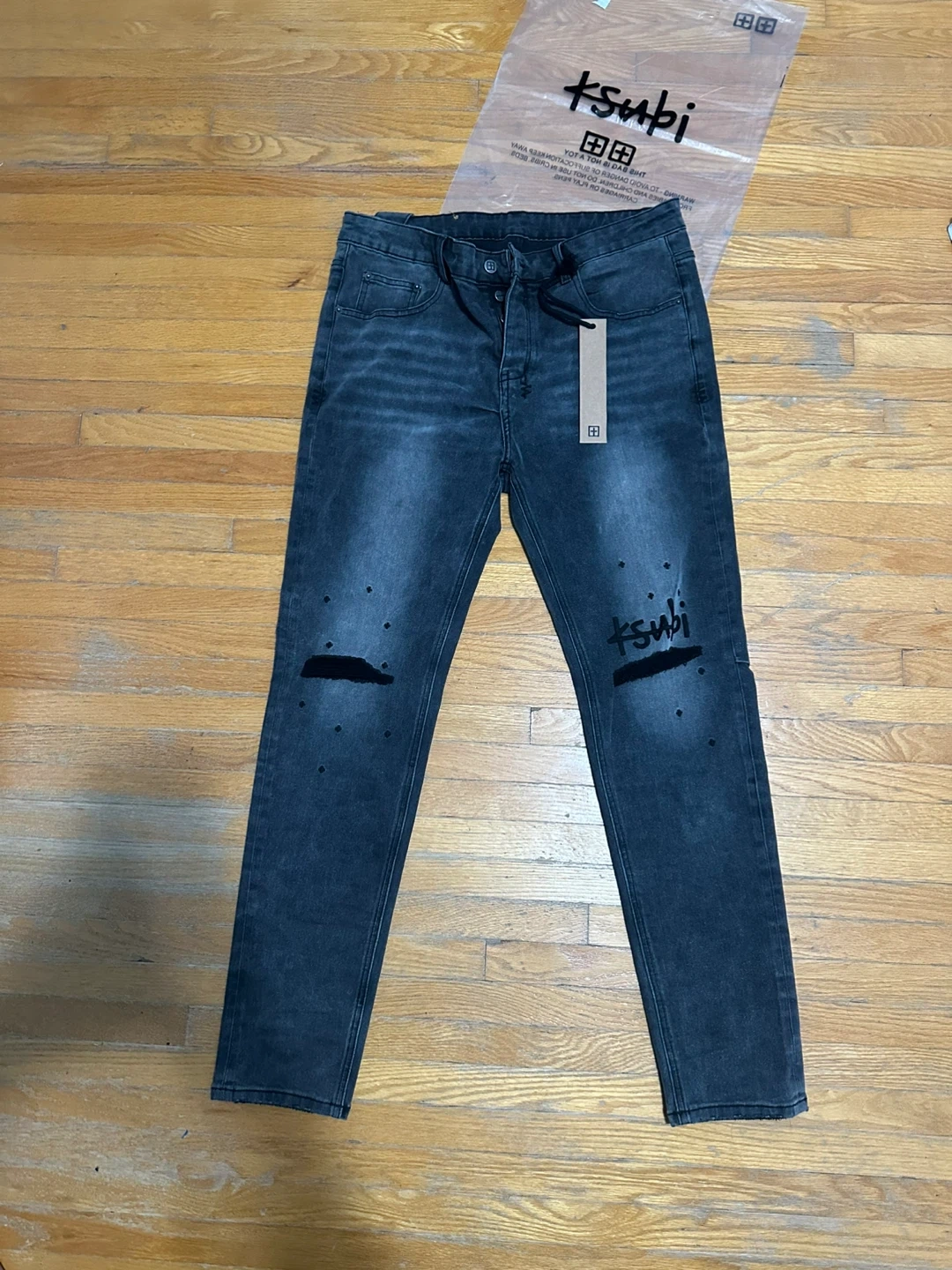 Selling a pair of Ksubi black denim jeans. They feature a stylish design with some distressed detailing. The jeans are in good condition and come with the original packaging.