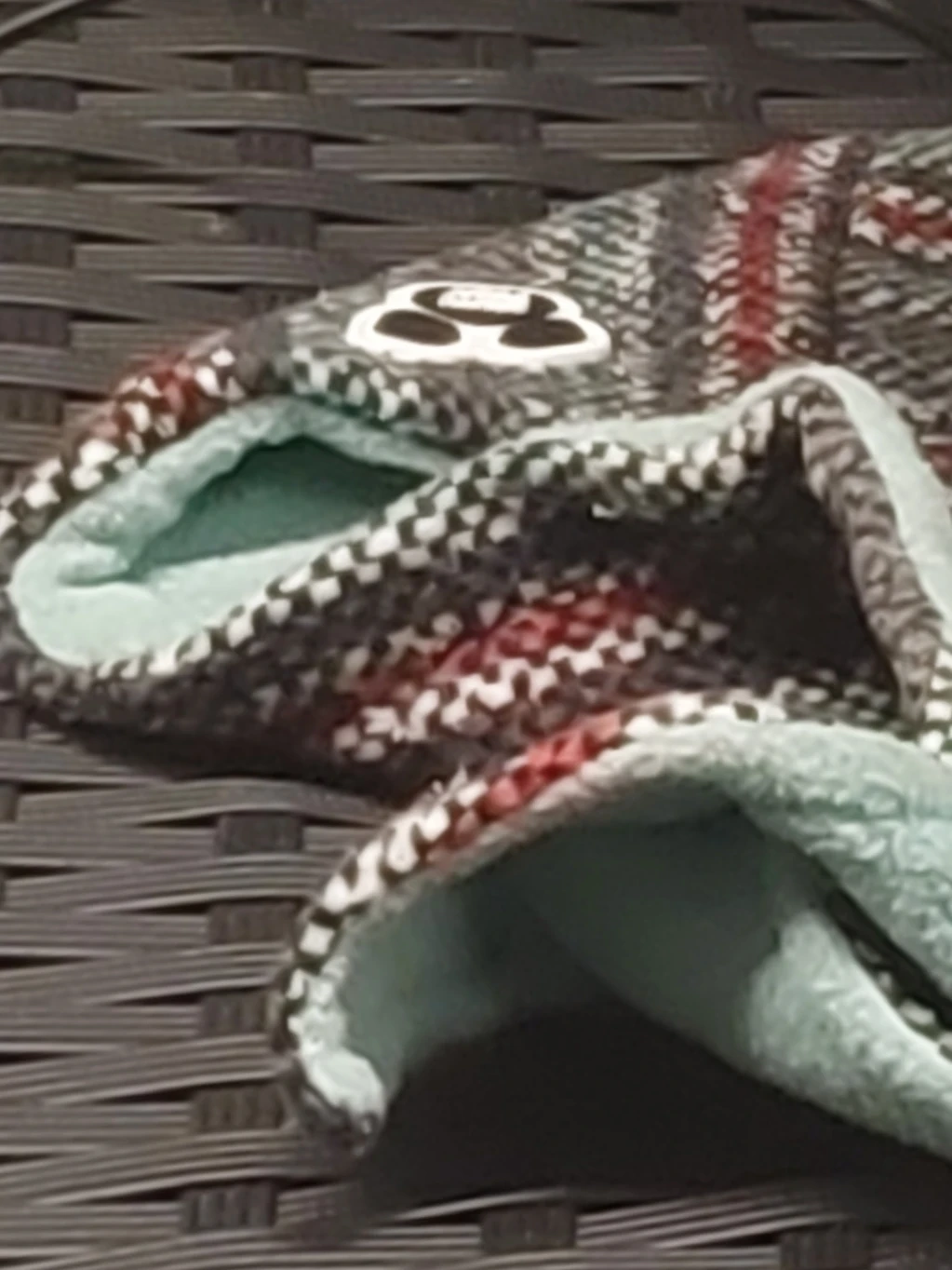 Cozy Under Armour beanie with a soft, light blue interior lining! The outer material has a woven pattern in shades of grey, white, and red. Perfect for keeping warm on chilly days!