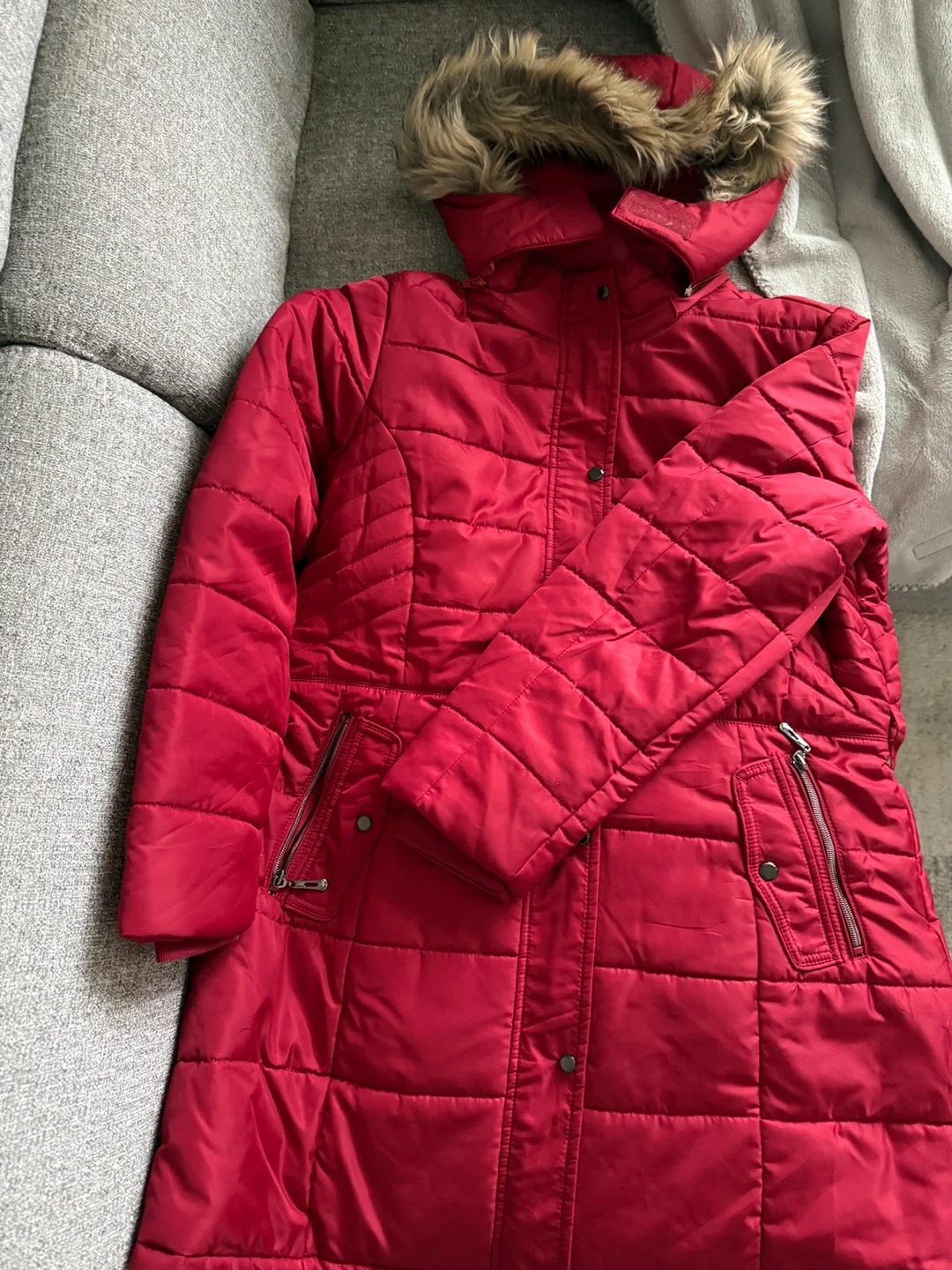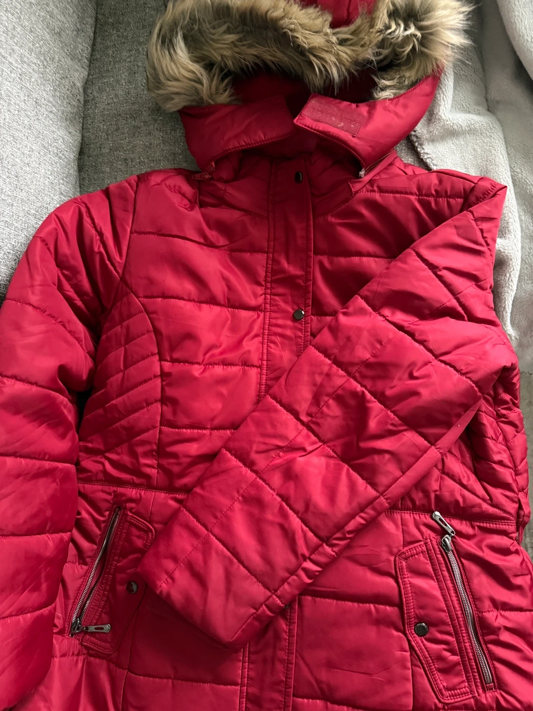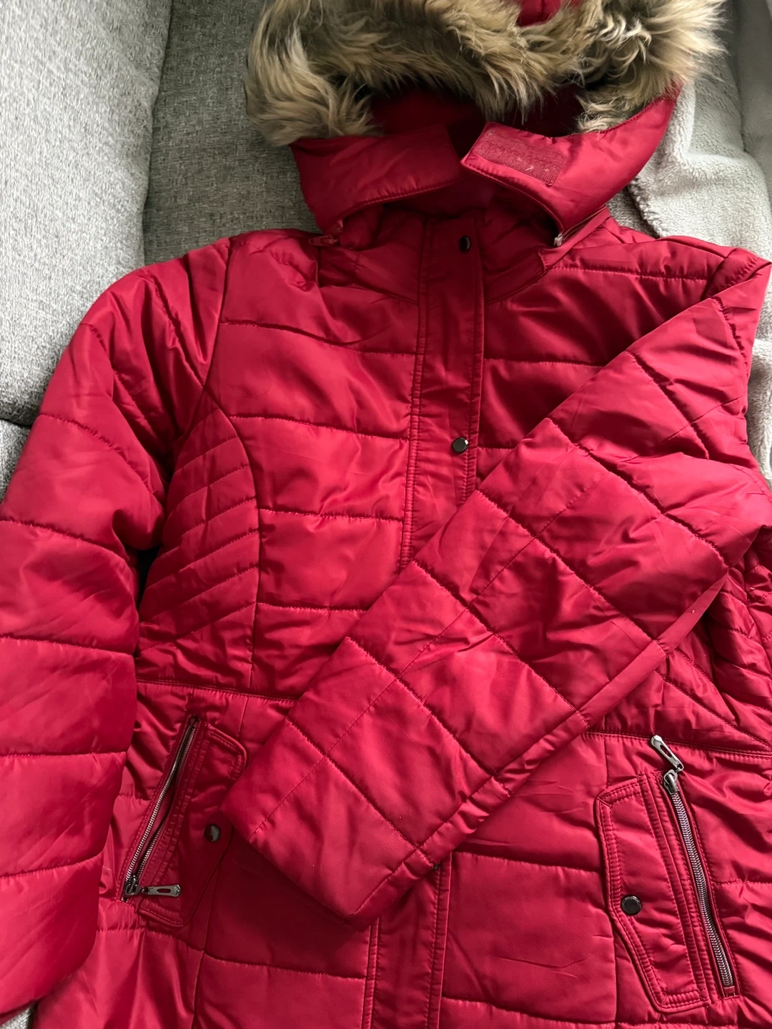 A stylish red puffer coat with a cozy faux fur hood! It's perfect for staying warm during the colder months. This coat features a quilted design and functional pockets with zippers. A great addition to your winter wardrobe!