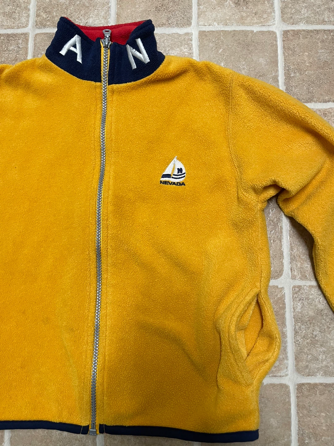 Cozy Nevada fleece jacket in a vibrant yellow! The jacket features a full zip and a stylish navy blue and red collar. Perfect for layering on those cooler days!