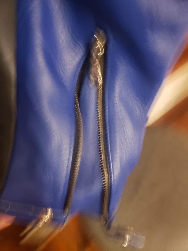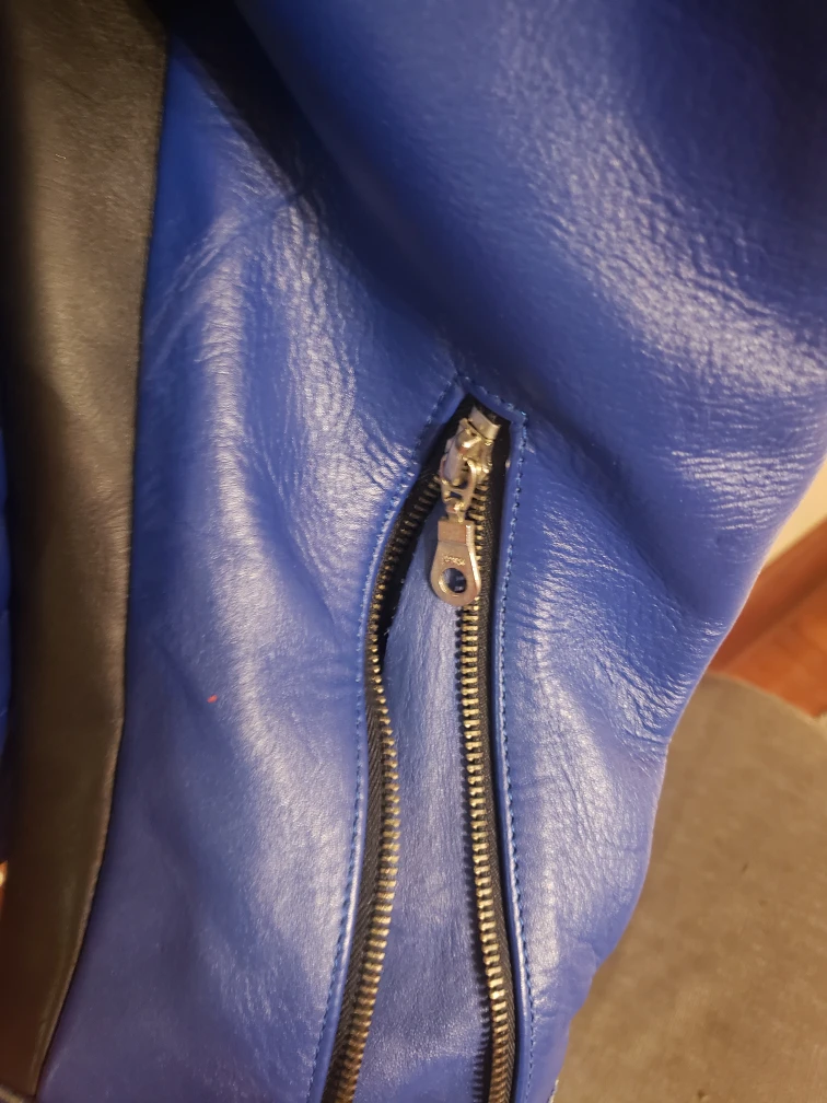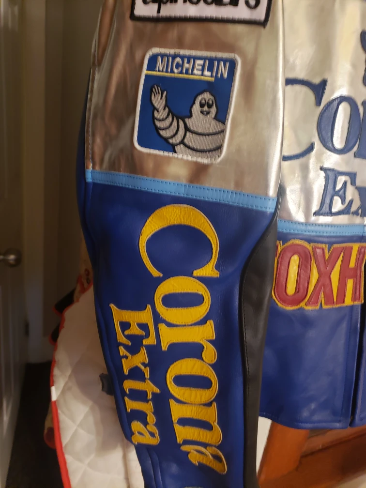 Selling a Corona Extra Super Bike leather jacket in size L. The jacket is blue, yellow, and silver with various patches including Michelin, NGK, Dunlop, and Fog City. It also includes a zipper and additional hardware in a small bag.