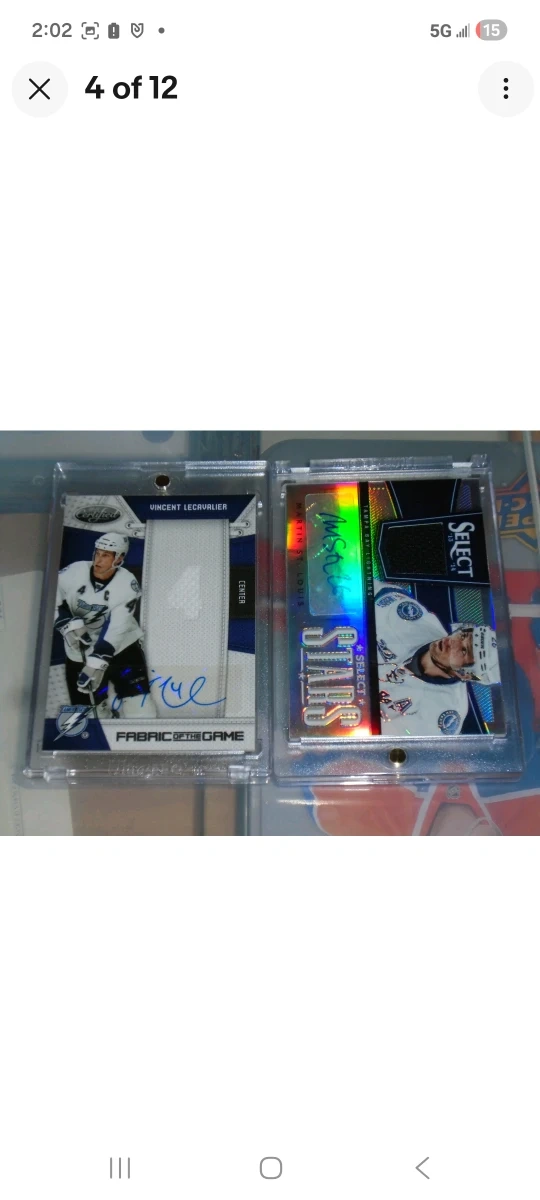 Selling a couple of Vincent Lecavalier hockey cards. One is a Certified Fabric of the Game card, and the other is a Select card. Both are in protective cases and feature pieces of game-worn material and autographs! Both these cards will ship free to you with tracking. Enjoy the dynamic duo!